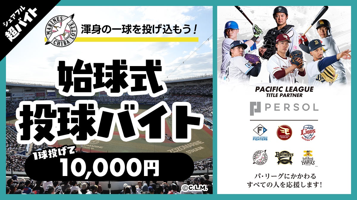「はたらいて、笑おう。」をビジョンに掲げるパーソルグループのスキマバイトアプリ『シェアフル』やSaaSシフト管理サービス『シェアフルシフト』、就業実績を活用した人材紹介サービス『シェアフルエージェント』などを提供するシェアフル株式会社(本社:東京都港区、代表取締役社長:横井 聡)は、2025年6月15日(日)にZOZOマリンスタジアムで行われる、「千葉ロッテマリーンズ vs 東京ヤクルトスワローズ」の始球式にて投球する超バイト※を募集します。