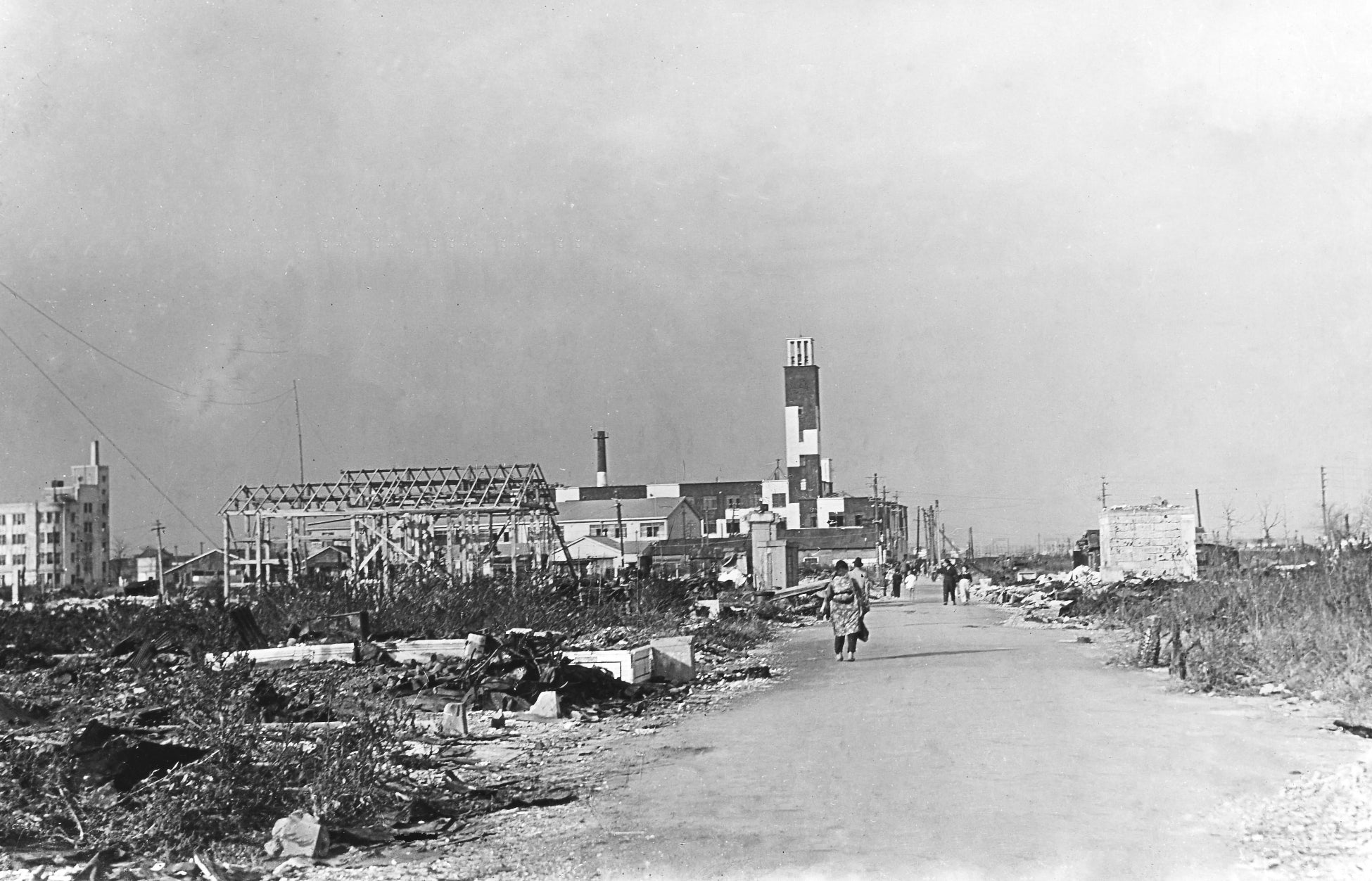 (2)市役所付近の焼け跡 (平和通りから市役所方面を撮影)