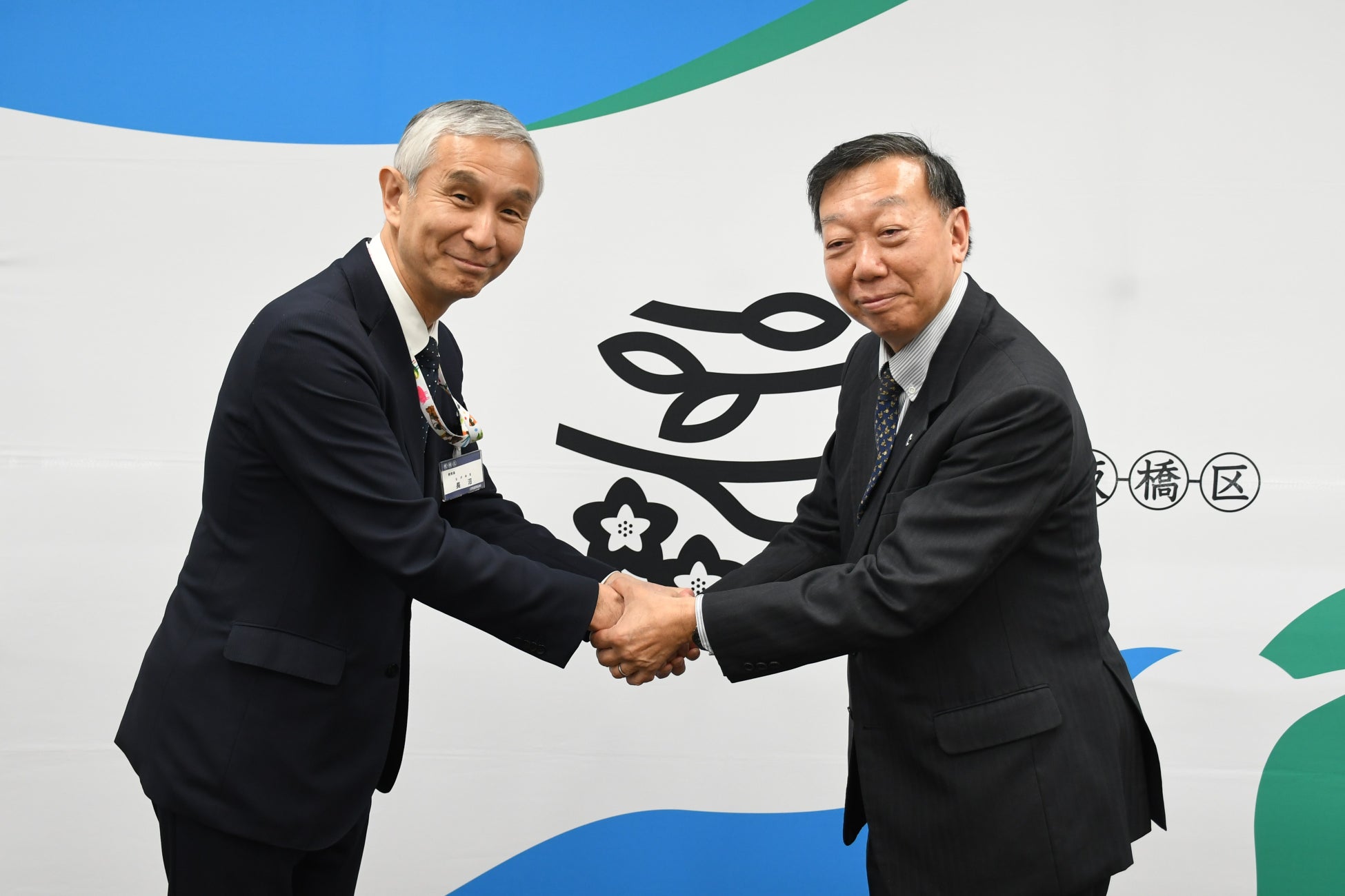 板橋区教育支援センター研修室で行われた協定締結式には、学習院大学 学長 遠藤 久夫氏と板橋区教育委員会 教育長 長沼 豊らが出席。お互いに署名を行った協定書を交換し、固い握手を交わしました。