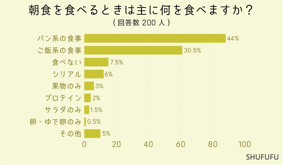 朝食を食べるときは主に何を食べるかに関しては1位「パン系の食事(44%)」、2位「ご飯系の食事(30.5%)」でした。ご飯よりもパンの方が人気のようですね。朝は重たい食事が受け付けないという方も多そうです。