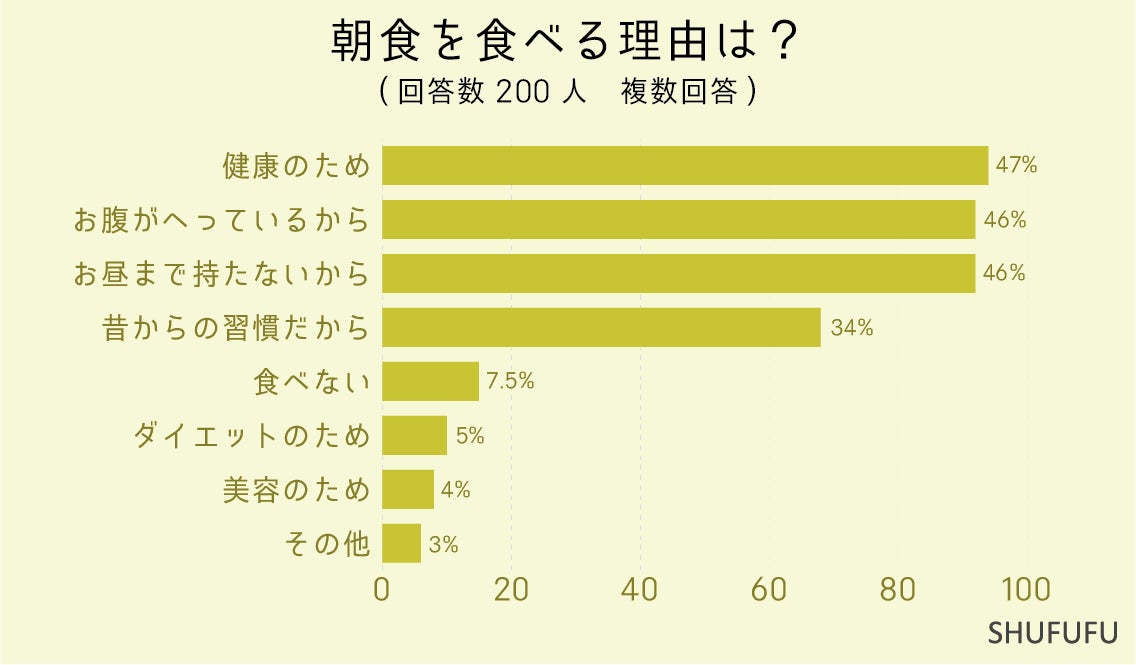 朝食を食べる理由を尋ねたところ、1位は「健康のため(47%)」、2位「お腹がへっているから(46%)」「お昼まで持たないから(46%)」となりました。朝食を食べないと元気が出ないですし、ちゃんと毎日食べたいですね。