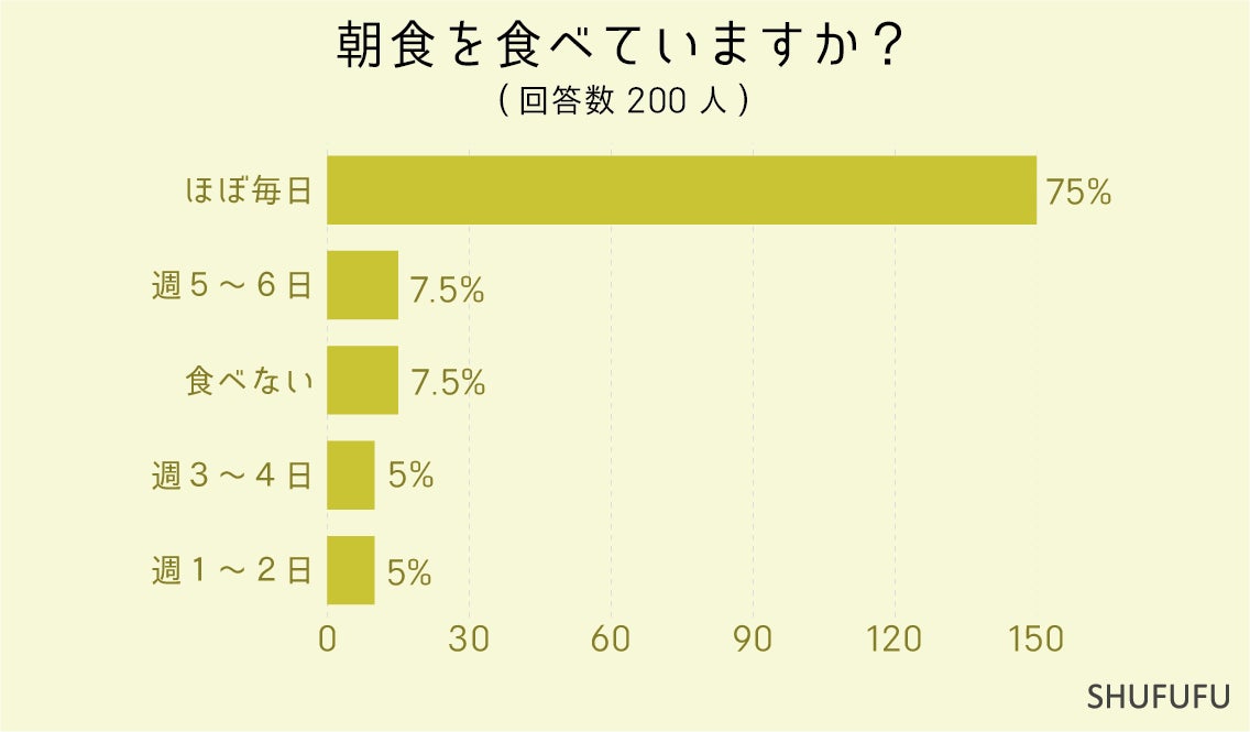 朝食を食べていますか?の問いに対して最も多かったのが「ほぼ毎日(75%)」でした。 次いで「週5〜6日(7.5%)」「食べない(7.5%)」という結果でした。週5日以上食べている方が80%以上になりました。