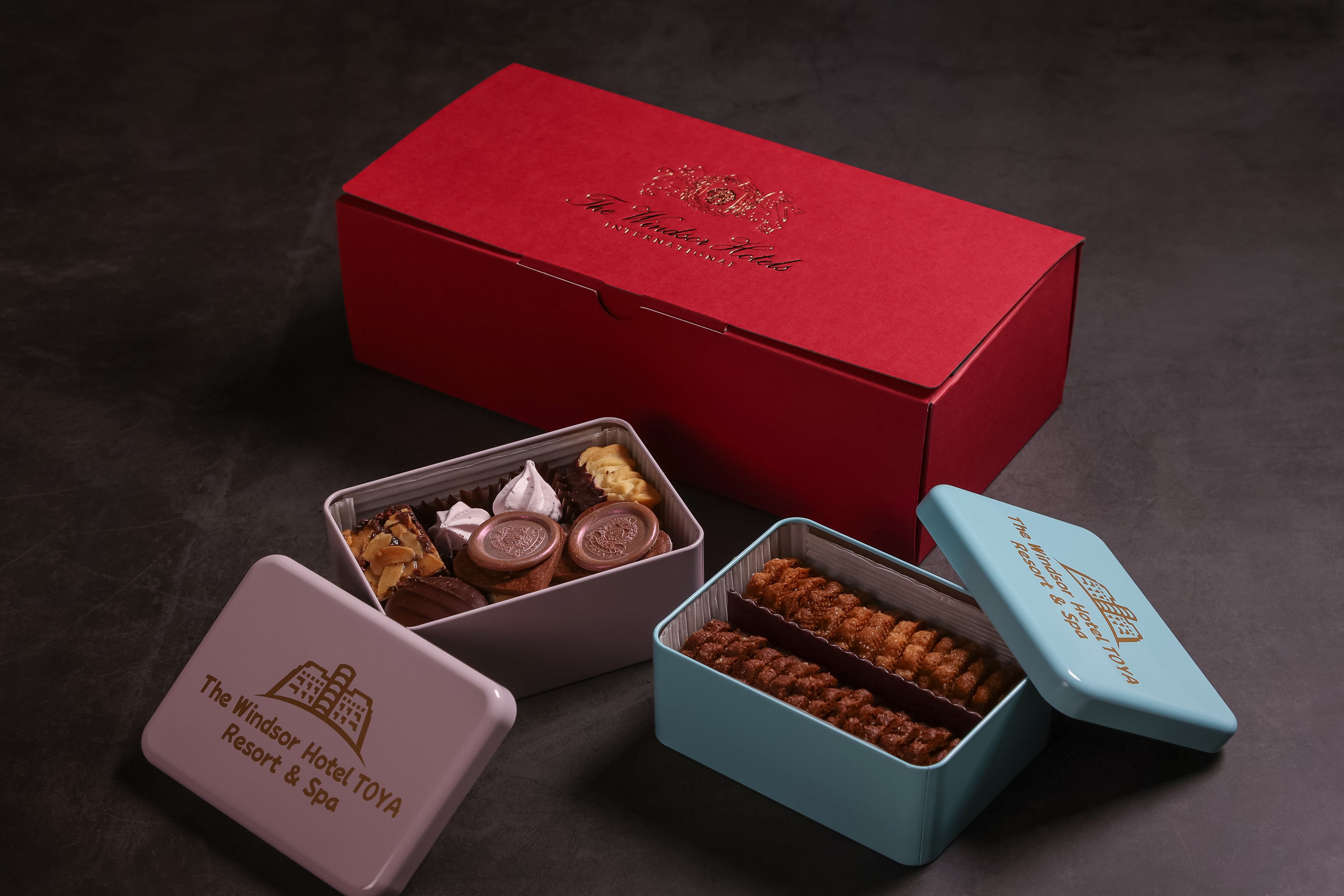ホテルロゴ入りのオリジナルクッキー缶2種を詰め合わせにしました。