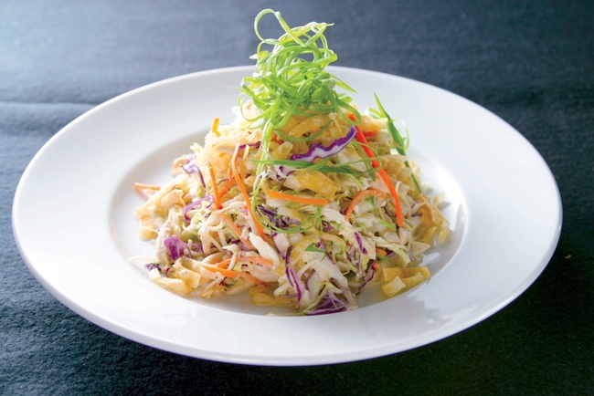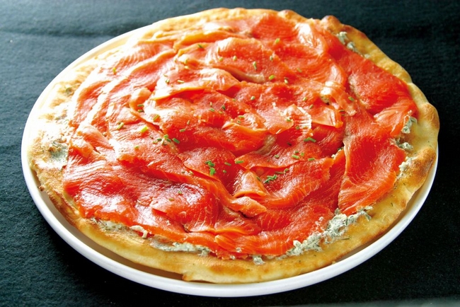 ■メニュー一例:スモークサーモンピザ(S1,500円・R2,000円)シノワチキンサラダ (980円)
