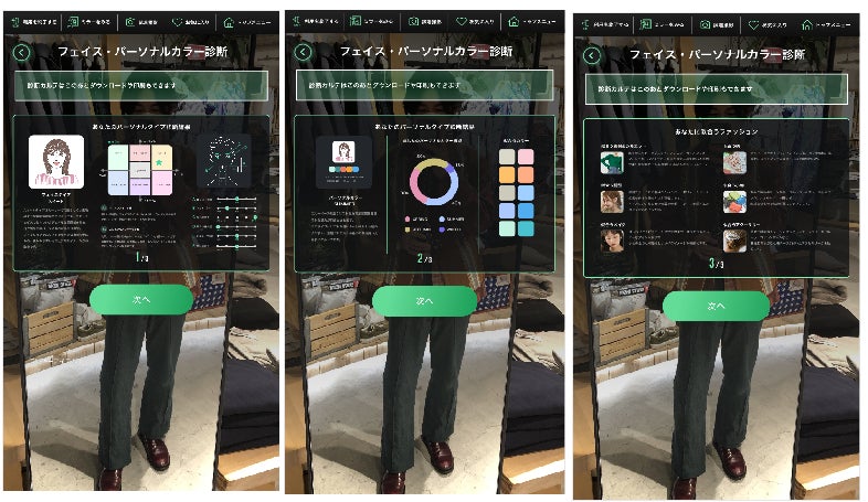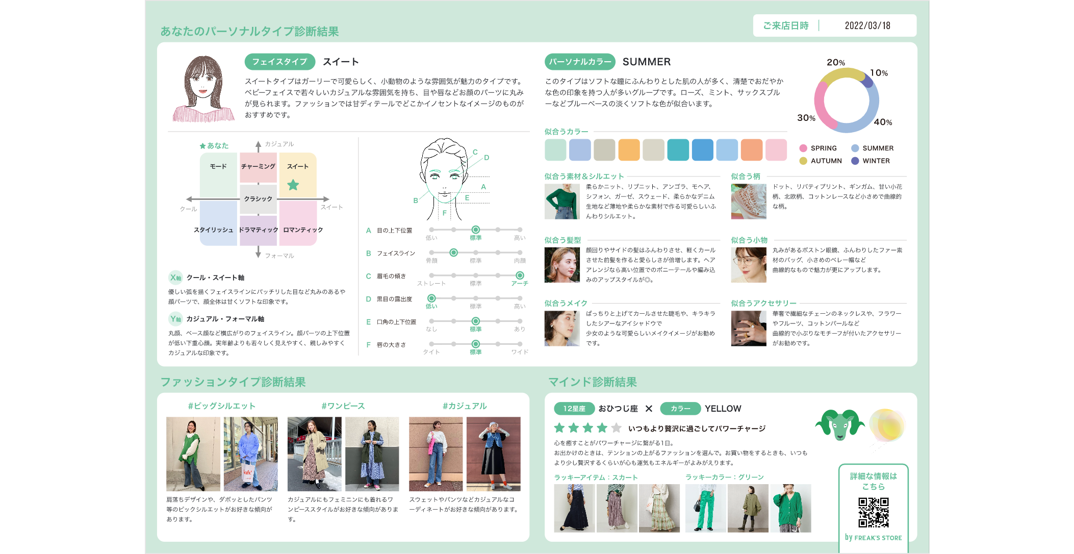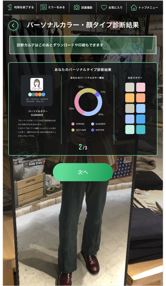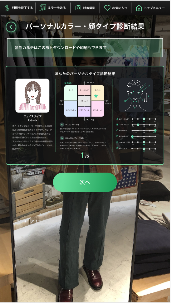AI身体解析テクノロジーに強みをもつ株式会社Sapeetが提供するアルゴリズムを使用したAIカメラで撮影し、フェイス・パーソナルカラーを診断可能に。診断結果からユーザーに似合うおすすめのアイテムとコーディネートをご提案いたします。診断結果は紙のカルテやWEBページでもお持ち帰りいただけます。