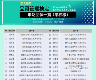 どのような組織がQC検定に取り組んでいるのかをご紹介いたします。下記URLに、第35回QC検定(2023年3月19日)を団体申込みで受検された企業・団体・学校のうち、名称公表の承諾をいただいた組織の一覧を掲載しています。ぜひご確認ください。