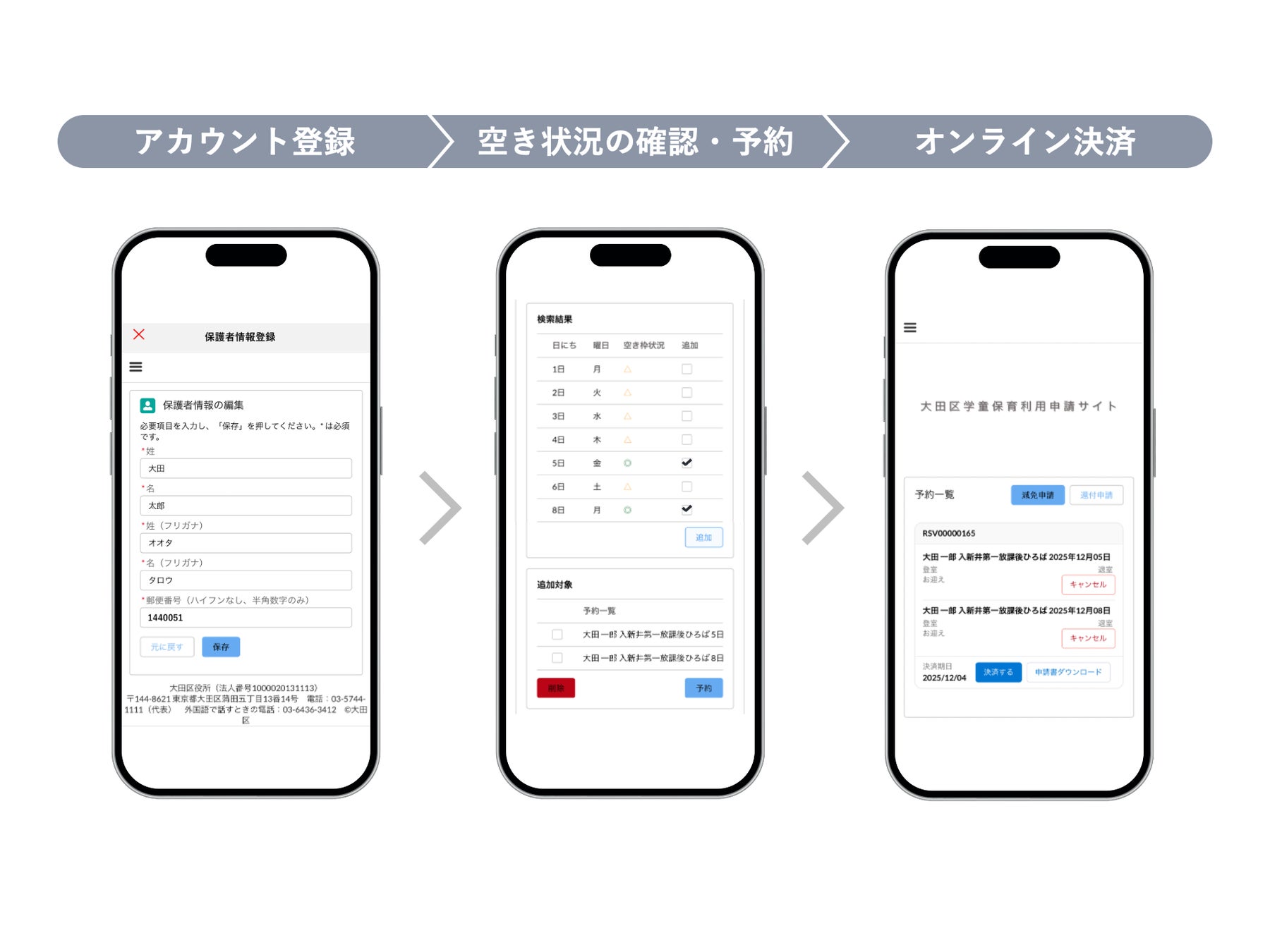 これにより、大田区では、学童保育(一時利用)を利用する保護者がスマートフォンやパソコンから24時間いつでもどこでも申請・学童保育料の支払いが可能となり、手続きのための来庁や電話連絡が不要となります。