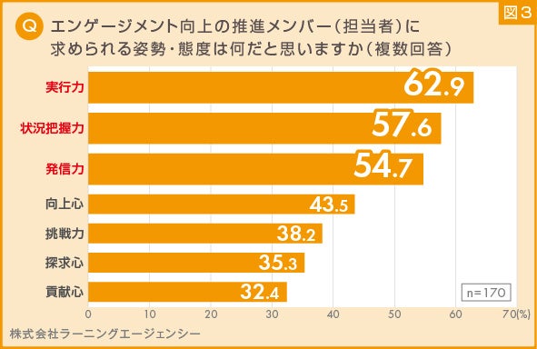 結果、エンゲージメント向上を推進する際には、「実行力」が必要だと回答する割合が最も高く62.9%となりました。次に「状況把握力(57.6%)」「発信力(54.7%)」が続きました。自ら取り組む姿勢と、状況把握や発信力などの周りを巻き込む力が求められることが読み取れます。(図3)