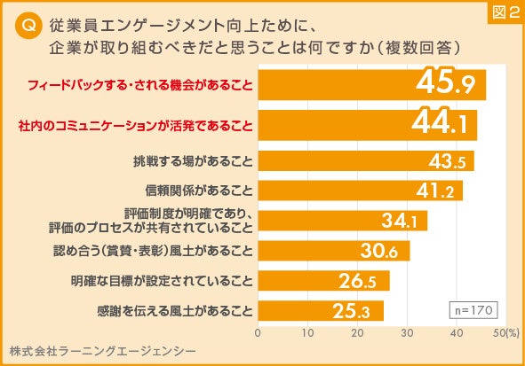 次に、経営者・人事担当者が考える、エンゲージメント向上のために取り組むべきだと思うことについて質問したところ、「フィードバックする・される機会があること」が45.9%と最も高い割合となりました。次に、「社内のコミュニケーションが活発であること」が44.1%と続きました。これより、従業員同士の対話の場が重視されていることがわかります。(図2)