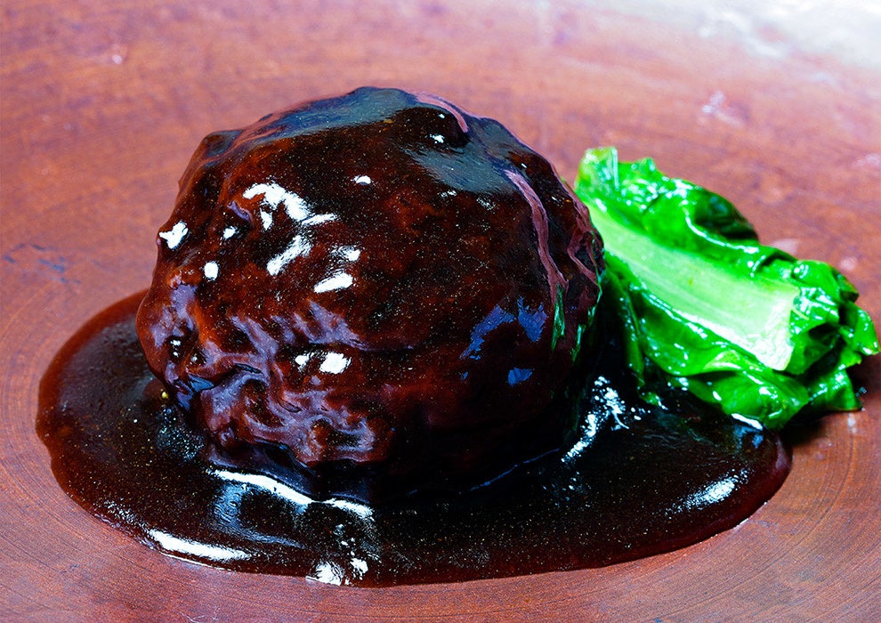 高温の油で揚げた猪の肉団子を、中国の黒醤油、紹興酒、三温糖などで2時間30分かけて煮込みます。
