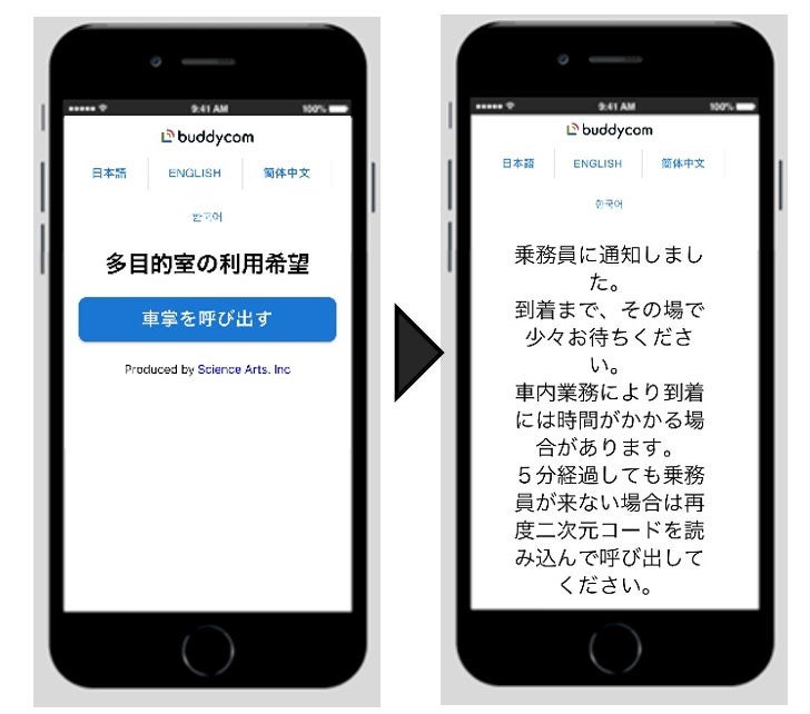 サイエンスアーツでは、本実証実験に採用されたBuddycomベルをα版として機能提供を開始いたします。今後、お客様のご要望を集約しさらなる機能開発を進め、鉄道業界をはじめ小売・宿泊・観光・無人店舗など新しいマーケットへの提案を進めてまいります。
