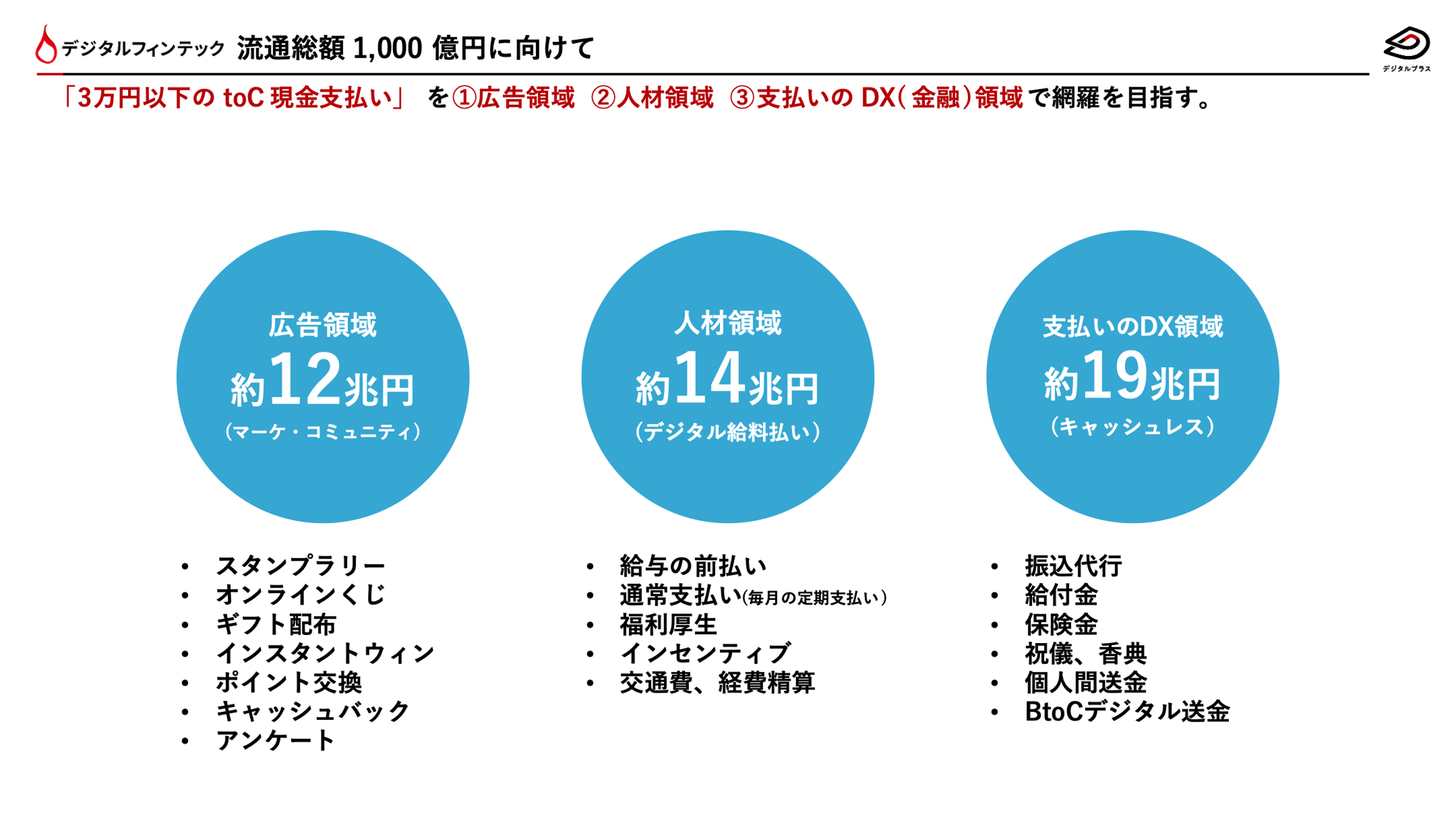 広告領域・人材領域・支払いのDX(金融)領域の3つの領域を注力領域としてあげ、3万円以下のtoC向け支払いでのシェア拡大を目指し邁進しております。