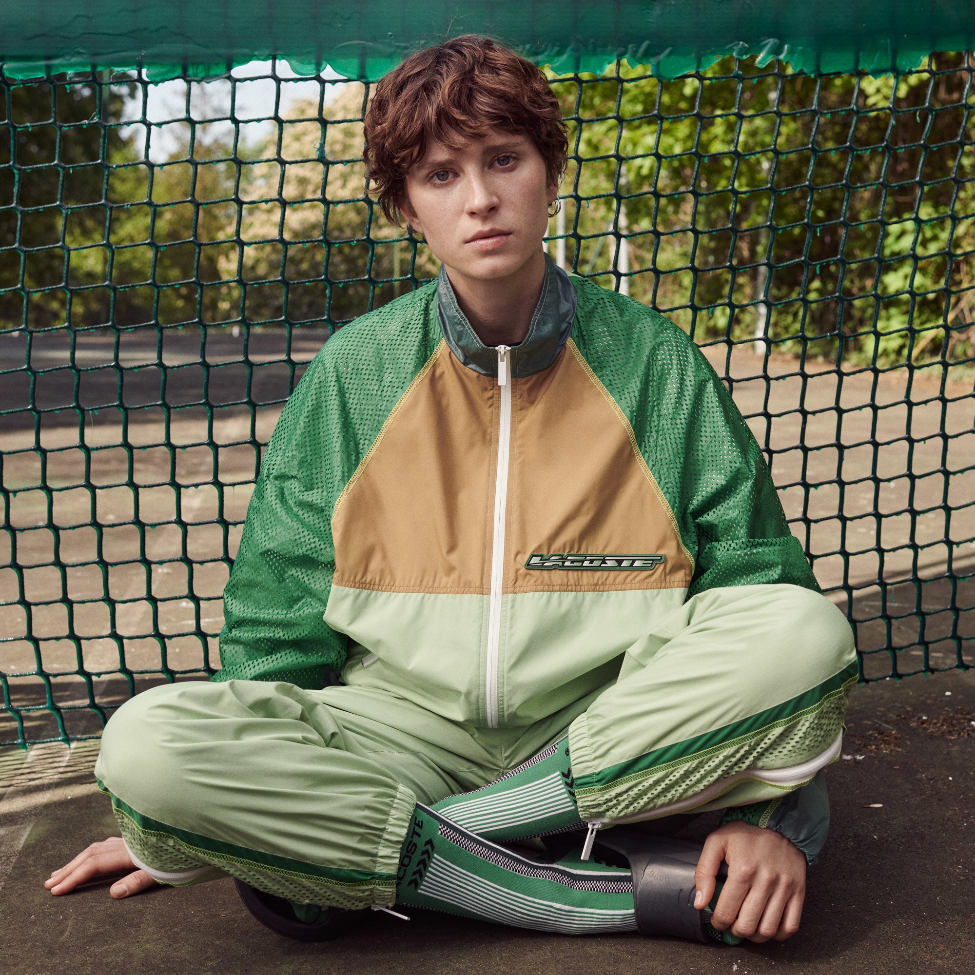 新たなカラーの試みとして、ラコステグリーン、ネイビー、トープ、ブラック、オプティックホワイトのクラシカルなラコステパレットに対して、スカーレット、エメラルド、バーガンディー、オレンジ、アシッドイエローといった明るく温かみのある色を重視することで、これまでの伝統的なスポーツの認識を変えました。素材の通気性や換気はメッシュのロゴパネルを採用し、通気性の良いインサートは、トラックショーツに用いました。テニスバイザー、ネオプレンジャージー素材の平たいツバ付5パネル ”ジロール” キャップにて、はつらつとしたエスプリを強調しています。