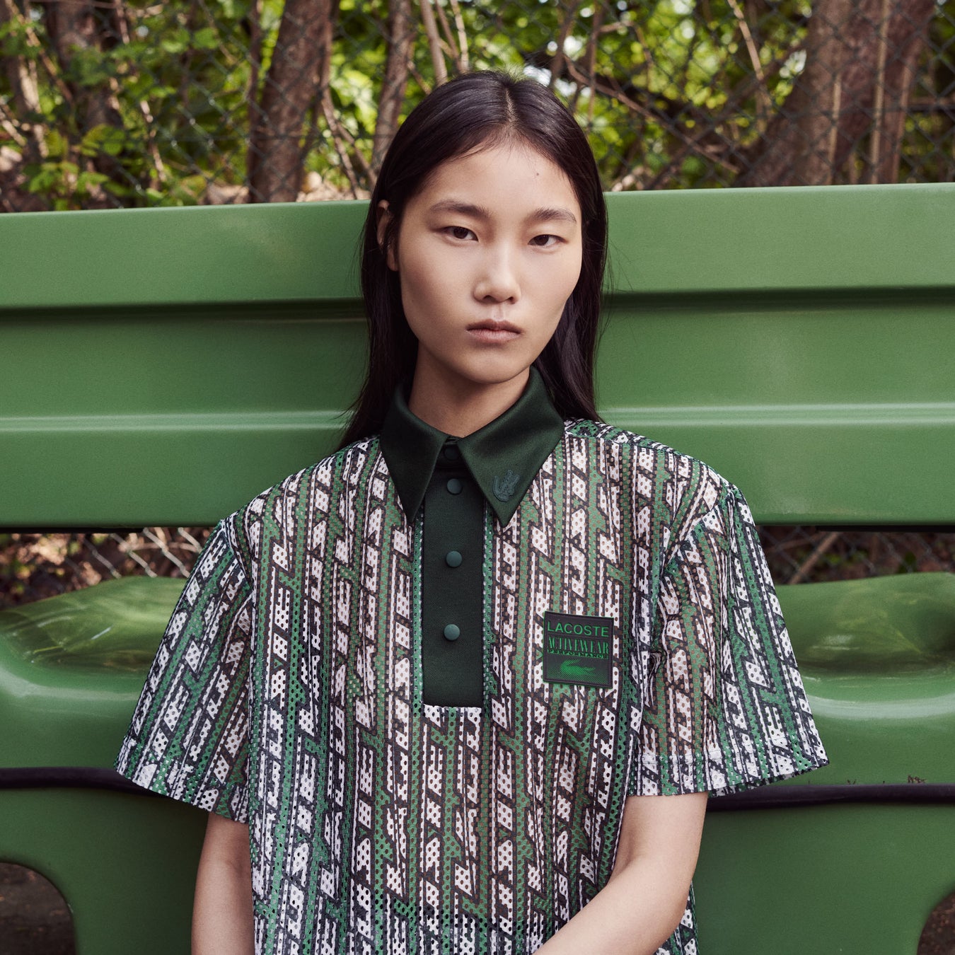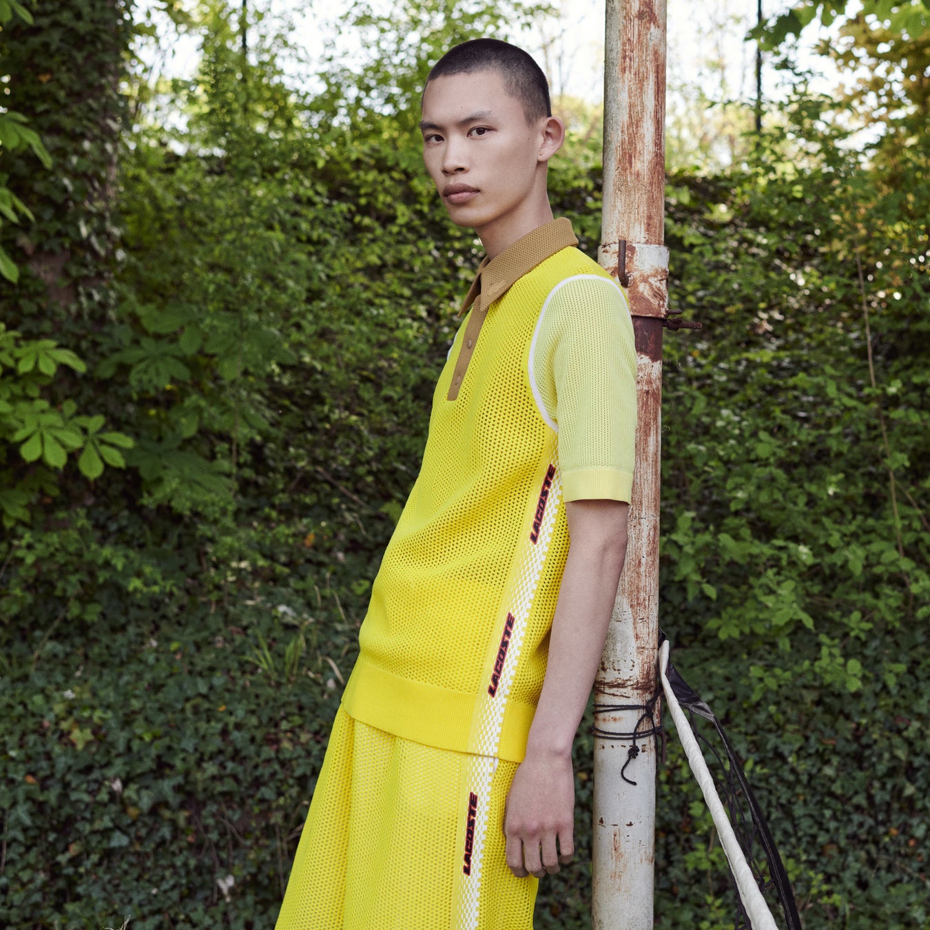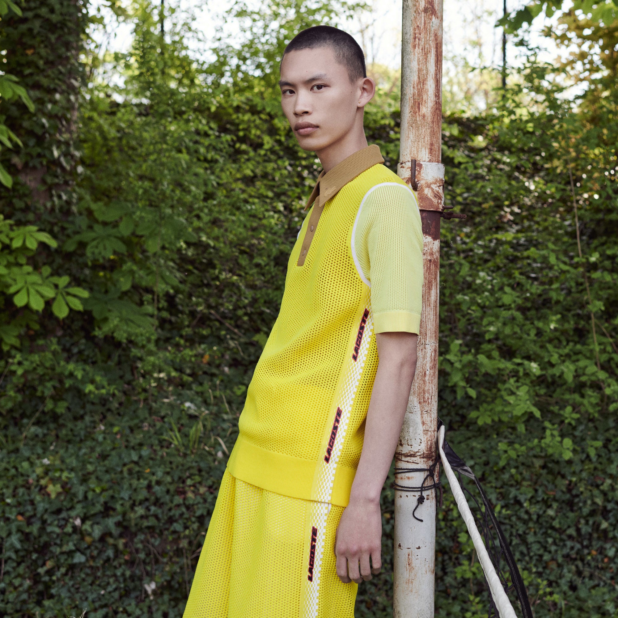 スポーティさが際立つメンズ・ウィメンズそれぞれに目をやると、表層的な技術革新はもちろん、ディテールに至るまでこだわり抜かれ、格段に進化を遂げています。狂騒の1920年代のルネ・ラコステと彼のテニスパートナー、スザンヌ・ランランのエレガントなポートレートから、2000年代のピーター・サザーランドとフィリップ・ビアロボスによるメッセンジャーのリズミカルなドキュメンテーションに至るまで、テーラーとスポーツの融合の変遷は、ハイブリッドな類型学の結果であり、スポーツサブカルチャーとしての一面も持ち合わせています。ショートスーツはネオプレン素材のピケジャージーから作られ、ポロシャツはプリントメッシュで再構築されています。