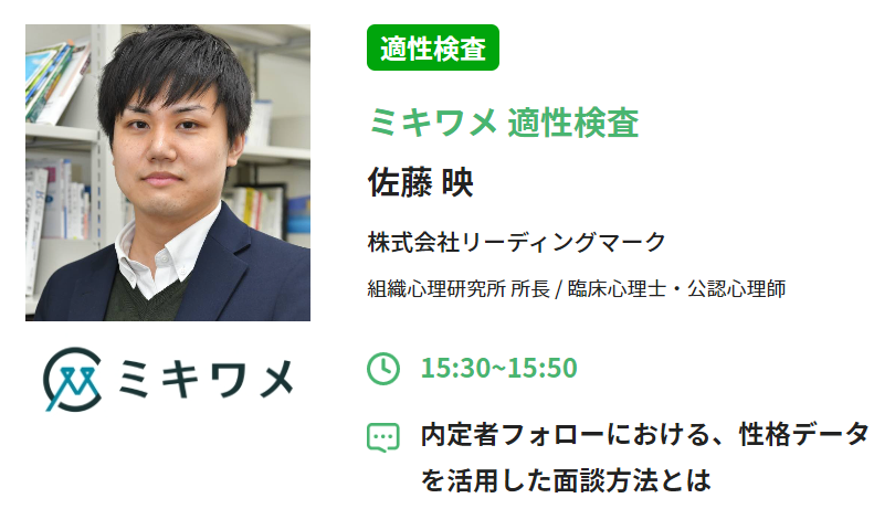弊社からは「内定者フォローにおける、性格データを活用した面談方法とは」というテーマで、20分間講演させていただきます。