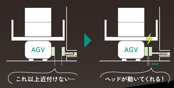 今回、AGV・AMR上に台車を担いでいて従来のワイヤレス充電システムだけではバッテリーに充電することが困難だったお客様に向けて給電ヘッド押し出しユニットの発売を開始しました。