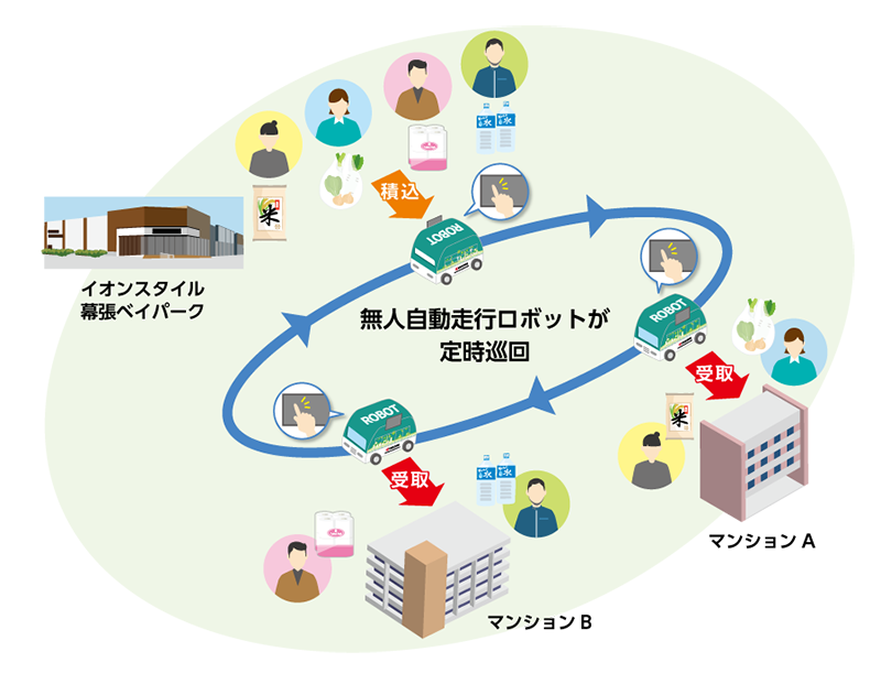 本実証実験では、イオンスタイル幕張ベイパークの協力のもと、近隣のマンションにお住まいの方が同店舗で購入した商品を、共用ロッカーを搭載した定時巡回するロボットに積み込み、マンションで受け取ります。重量物やかさばる荷物の持ち帰りを支援するロボット活用サービスを実証し、外出や買い物をより楽しんでいただくことを目指しています。