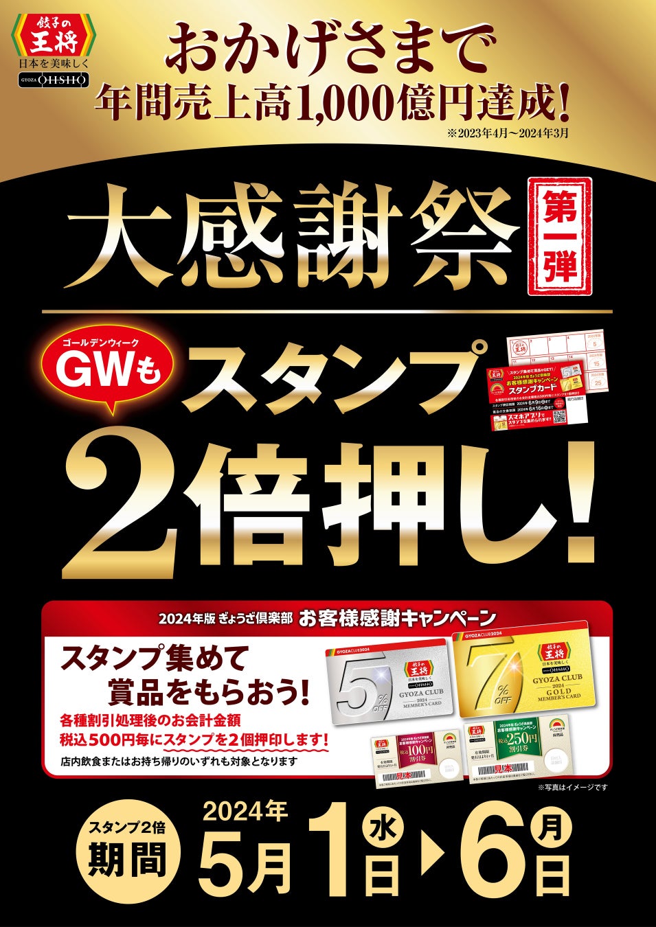 『大感謝祭』第一弾として、ゴールデンウィーク期間と重なる2024年5月1日(水)から5月6日(月)の期間限定で、『2024年版ぎょうざ倶楽部 お客様感謝キャンペーン』の『スタンプ2倍押し!』を実施いたします。