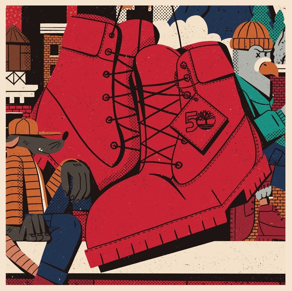 「カラー ブラスト」は、履くことで自分らしさを表現できることをコンセプトに掲げ、「イエローブーツ」の素材やシルエットはそのままに、アッパーやシューレース、ヒールパーツなどをレッド、ピンク、ブルー 、ライトグリーン、グリーン、オレンジ、グレーの7カラーに染め上げたコレクションです。それぞれのカラーごとにスペシャルなビジュアルを制作し、レッドは温かみのあるフラットな作品を得意とするイラストレーターでデザイナーのネイサン・ウォーカー(Nathan Walker)、ピンクは浮世絵に着想した大胆な構図や奇抜な配色で知られるビジュアルアーティストでイラストレーターのアンドリュー・アーチャー(Andrew Archer)、ブルーはポップな色彩でノスタルジックな世界観を描くアニメーターでイラストレーターのユー・カイ(Yu Cai)、ライトグリーンは緻密な描き込みと色使いでストリートマインドを表現するグラフィティーアーティストのシェーン・ハロー(Shane Hello)、グリーンは壁画を彷彿とさせるユニークでアーティスティックな絵柄が世界的に評価の高いデザイナーのケリー・アンナ(Kelly Anna)、オレンジは美しい線画と優しく淡い色合いが人気のグラフィックデザイナーのマリオン・ベン=リサ(Marion BEN-LISA)、グレーはAIアートで著名ながら素顔が謎に包まれたデジタルクリエイターのジョアン(Joann)が手掛けています。