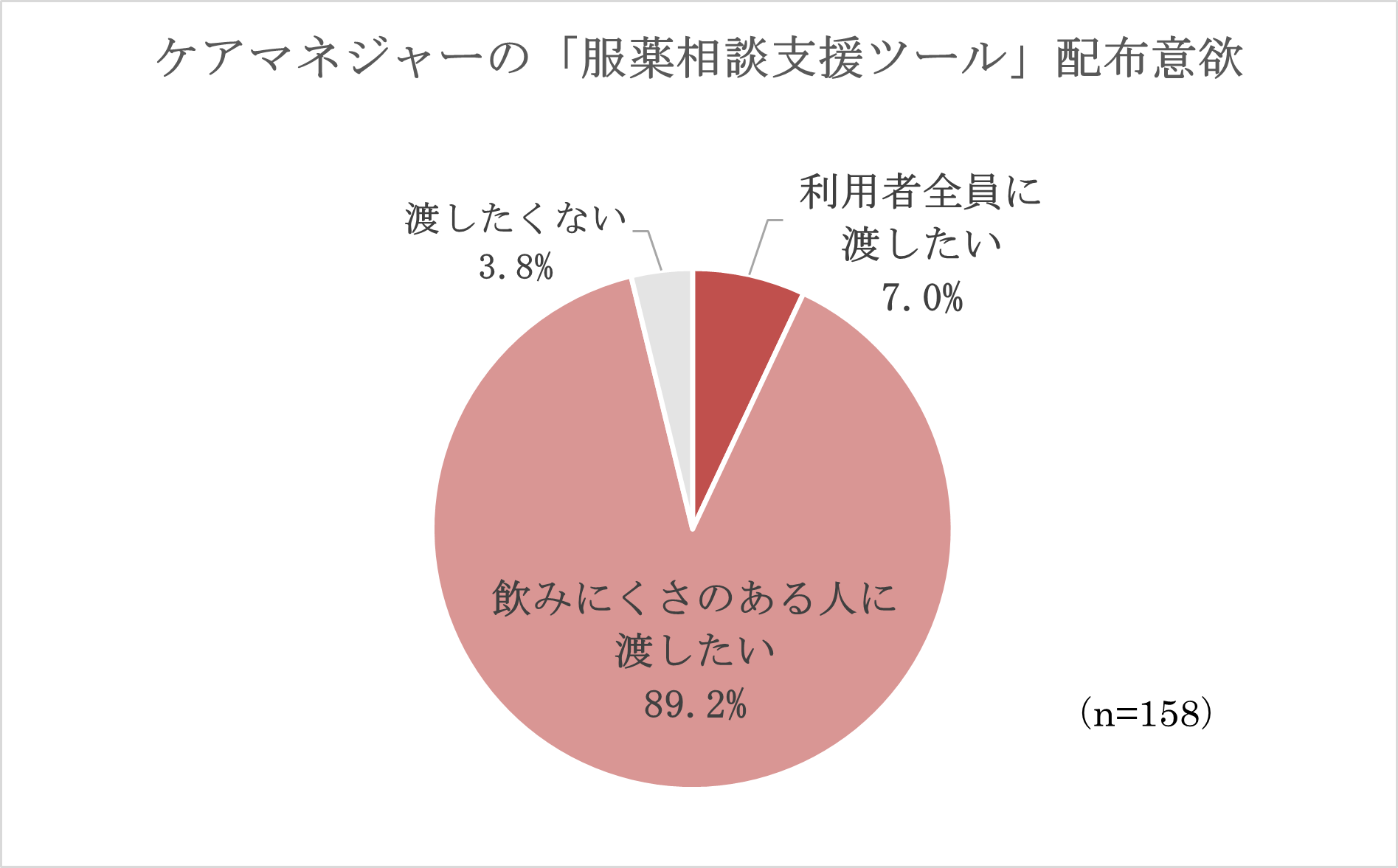 また、当調査では、介護者から医療従事者へ、直接的もしくは間接的に服薬のしづらさに対する情報を共有するという流れはあるものの、医師との連携のしにくさ、薬剤師との連携機会の少なさなどがあり、介護者が気付いた服薬状況に関する情報が十分に医療従事者に伝わっていない可能性が示唆されました。