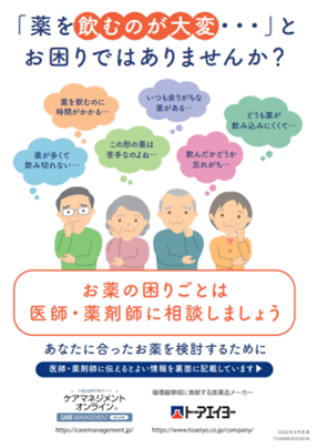 循環器医療において必要とされるスペシャリティファーマを目指し、循環器疾患治療剤を製造販売するトーアエイヨー株式会社(本社所在地:東京都中央区、代表取締役社長:髙橋 敦男、以下「トーアエイヨー」)と、介護支援専門員(ケアマネジャー、以下ケアマネ)向けの会員制ウェブサイト「ケアマネジメント・オンライン」を運営する株式会社インターネットインフィニティー(本社所在地:東京都品川区、代表取締役社長:別宮 圭一、以下「インターネットインフィニティー」)は、このたび全国約1万1千軒の居宅介護支援事業所を通じて、自宅で療養する要介護高齢者に「服薬相談支援ツール」(下記)を約33万枚配布しました。