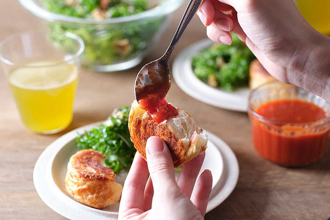 「デニッシュ・サレ」は、食事はとりたいけれど甘いパンや惣菜パンは重たいという時に、程良く満たしてくれるサイズ感。スコーンやマフィンなどと一緒に、おうちアフターヌーンティーのセイボリーとして盛り付けても◎。スタッフおすすめのアレンジは、デニッシュ・サレを市販のトマトソースにディップして、少し贅沢なスナックフードに。そのままでも十分美味しくお召し上がりいただけますが、オリーブオイル&胡椒にディップするなどお好みのアレンジもお楽しみいただけます。