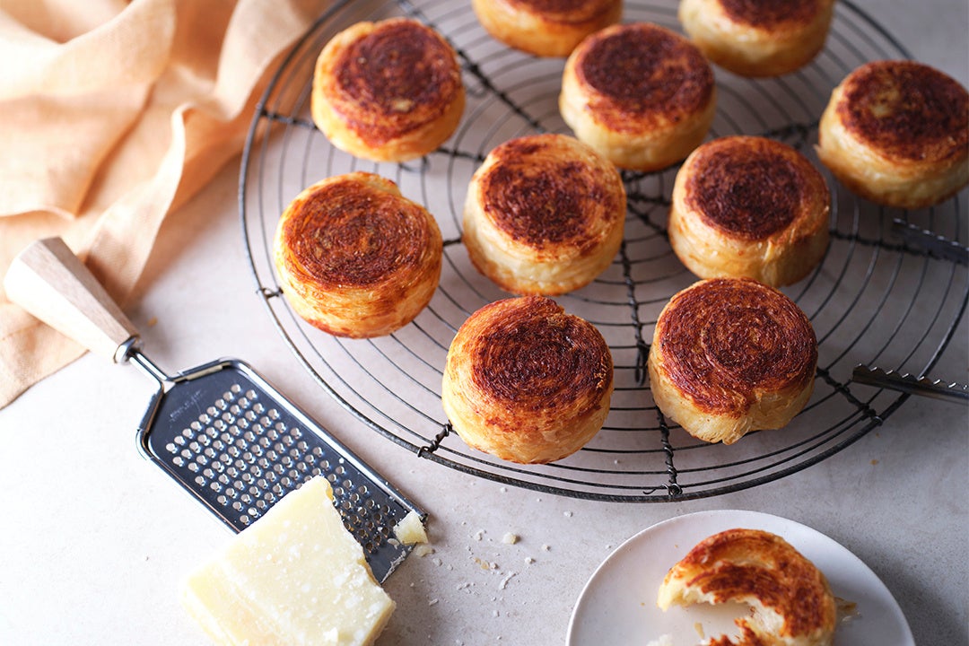 特長: 両面にパルメザンチーズを纏わせた、渦巻状の甘くないデニッシュ。パッケージを開けた瞬間からチーズがふわりと香り、食欲をそそります。サクッと軽く、朝食やおやつにも最適です。