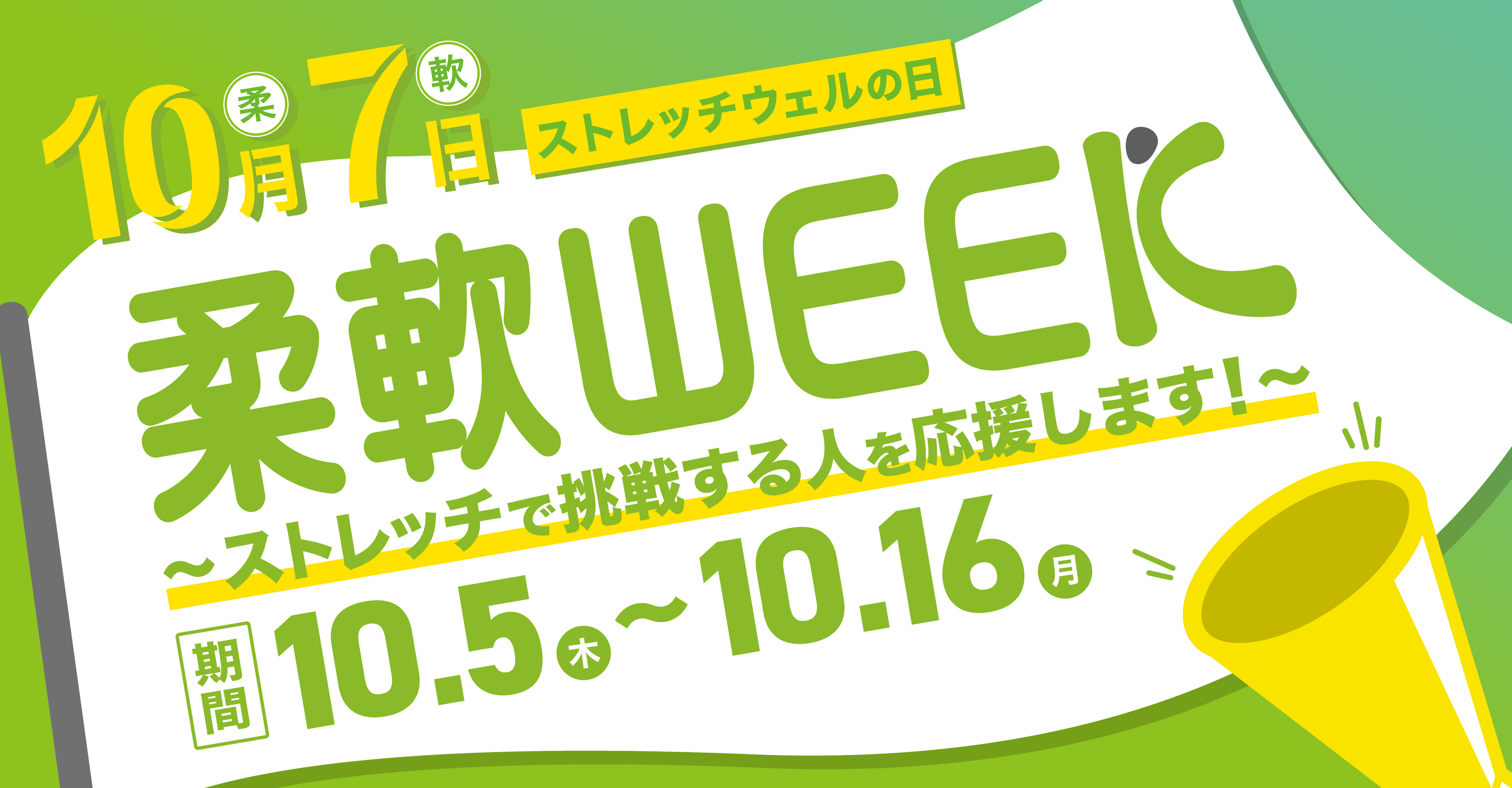 10月7日は「ストレッチウェルの日」。日本を代表して国際競技大会での活躍が期待されるアスリートやスポーツに励む学生達をストレッチで応援する。秋恒例の健康週間『柔軟WEEK』を開催!