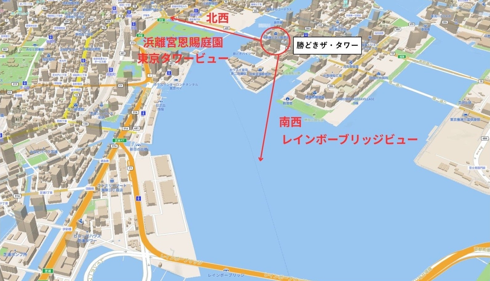 南西:レインボーブリッジを正面に望むことができ、夜景や開放感の面で圧倒的な価値。 南東:東京湾の水平線まで見渡せる景観が魅力。