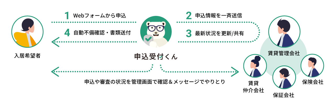 入居希望者がWEB上で入力した申込に必要な情報や申込手続きの進捗を、賃貸不動産管理会社、賃貸不動産仲介会社、家賃債務保証会社、保険会社などに連携し、申込書提出から審査までのやりとりを効率化することができる、不動産関連WEB申込受付システムです。現在、「申込受付くん」による賃貸物件電子入居申込数は年間約50万件(※1)で「入居申込サービス利用数 No.1 (※2) 」 を獲得、国内58社の保証会社と連携しています。
