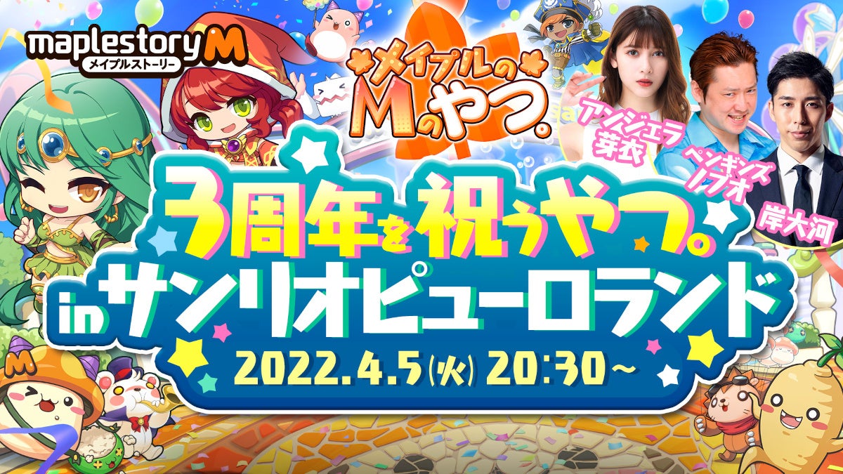 『メイプルストーリーM』、4/5(火)20:30より、サンリオピューロランドから3周年記念生放送を配信!