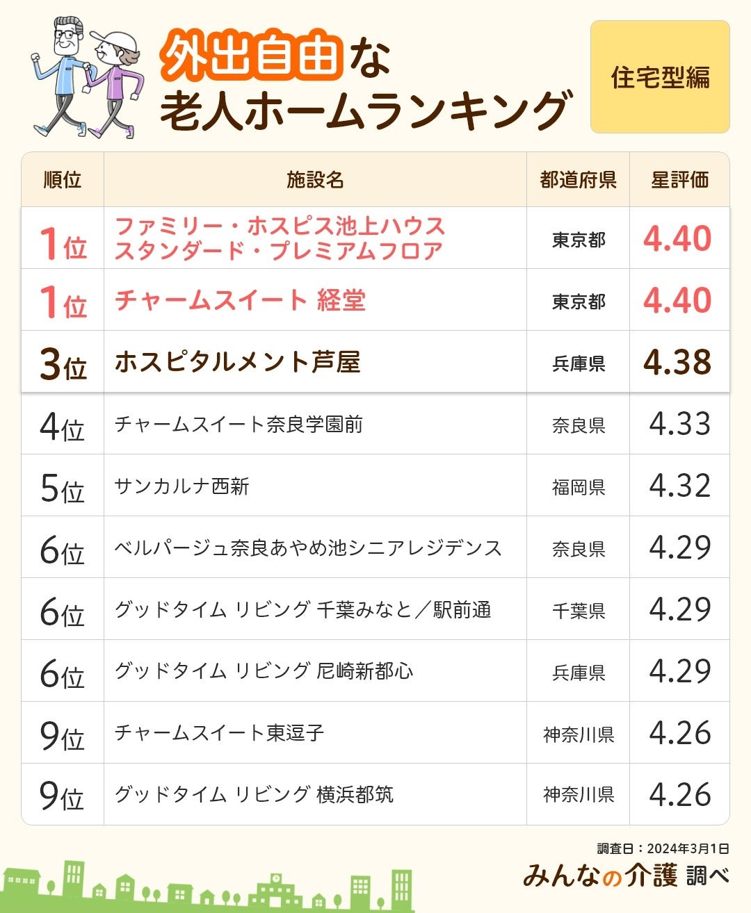 全国には外出が自由にできる老人ホームは現在5,595件あり(3/1時点)、今回はそのなかから、みんなの介護の星点数・評価が高い「介護付き有料老人ホーム」と「住宅型有料老人ホーム」のベスト10をご紹介します。