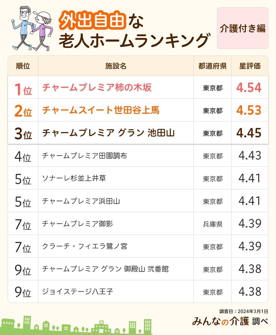 「みんなの介護」内に掲載している施設の中で、「外出自由な介護付き有料老人ホーム」は1,104件あります。星点数・評価が一番高かったのは「チャームプレミア柿の木坂」(4.54)で、2位は「チャームスイート世田谷上馬」(4.53)と「0.01」ポイント差の接戦となりました。ともに個室があったり、手厚いサポート体制となっていたりと、安心して暮らせる環境が整っている他、最寄駅から徒歩圏内でアクセスがいい、周辺に大きな公園がある等、気軽に外出した際でも利便性や楽しみが多くありそうです。口コミでも「週に一回のお散歩や近隣スーパーへのお買い物などの行事があり楽しそうな雰囲気でした」といったコメントも見られ、施設環境はもちろん、周辺環境を生かした取り組みも行っていました。