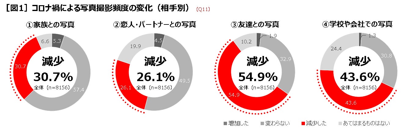 まず、写真撮影の頻度の変化を相手別に聞きました[図1]。家族と撮る写真は、コロナ禍以前と「変わらない」(57.4%)が多いものの、3割は「減少した」(30.7%)と答えています。恋人・パートナーと撮る写真も、半数は「変わらない」(49.5%)ものの4人1人は「減少した」(26.1%)と感じています。一方、友達との写真は半数以上が「減少した」(54.9%)と答え、学校や会社での写真も半数近くが「減少」(43.6%)しています。