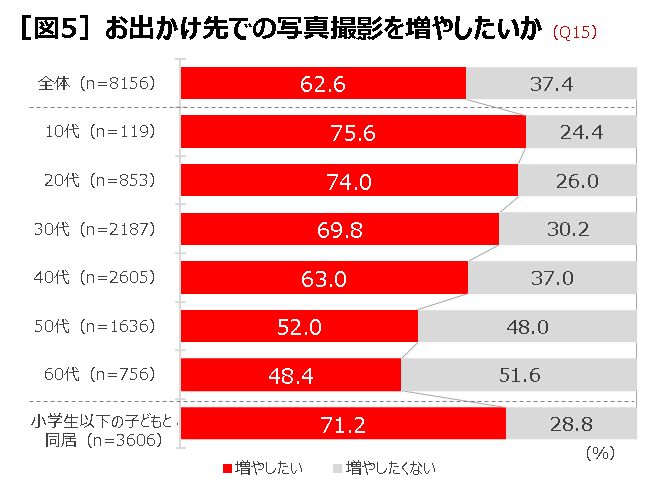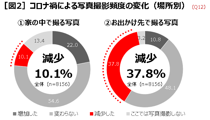 次に、家の中で撮る写真とお出かけ先で撮る写真の頻度の変化を聞きました。コロナ禍でおうち時間が増えたからか、2割は「増加した」(22.0%)と答えており、「減少した」(10.1%)と答えた人より多くなっています。一方、お出かけ先での写真は、4割近くが「減少した」(37.8%)と答えています[図2]。コロナ禍でお出かけ自体が減少し、写真を撮る頻度も少なくなっています。