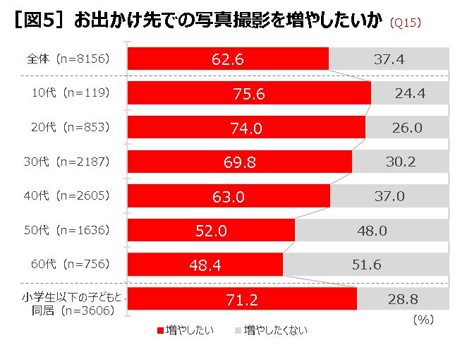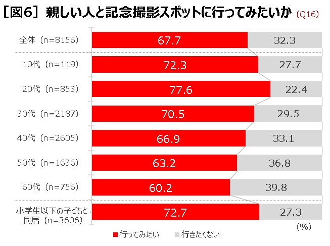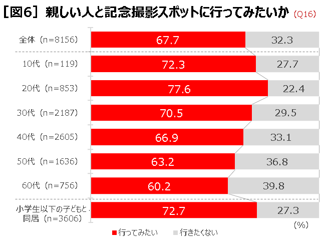 コロナの収束はまだ先になりそうですが、お出かけ先での写真撮影の機会を増やしたいかと聞くと、6割が「増やしたい」(62.6%)と答えました。年代別に見ると、10代75.6%、20代74.0%が高く、小学生以下の子どもと同居する人も71.2%と高くなっています[図5]。また、親しい人と記念撮影ができるスポットに行ってみたいかと聞くと、67.7%が「行ってみたい」と答え、10代は72.3%、20代は77.6%、小学生以下の子どもと同居する人は72.7%と、7割を超えています[図6]。