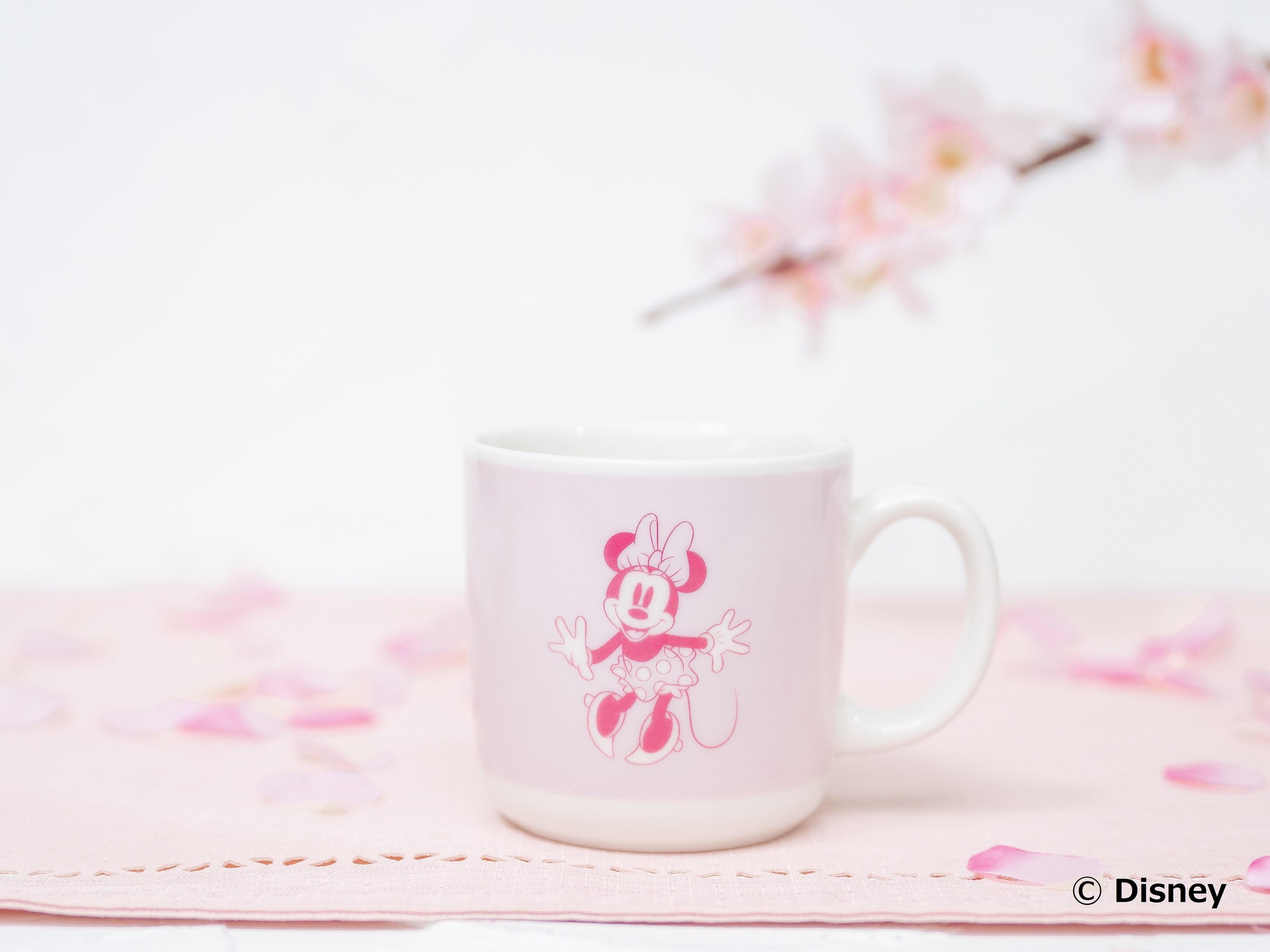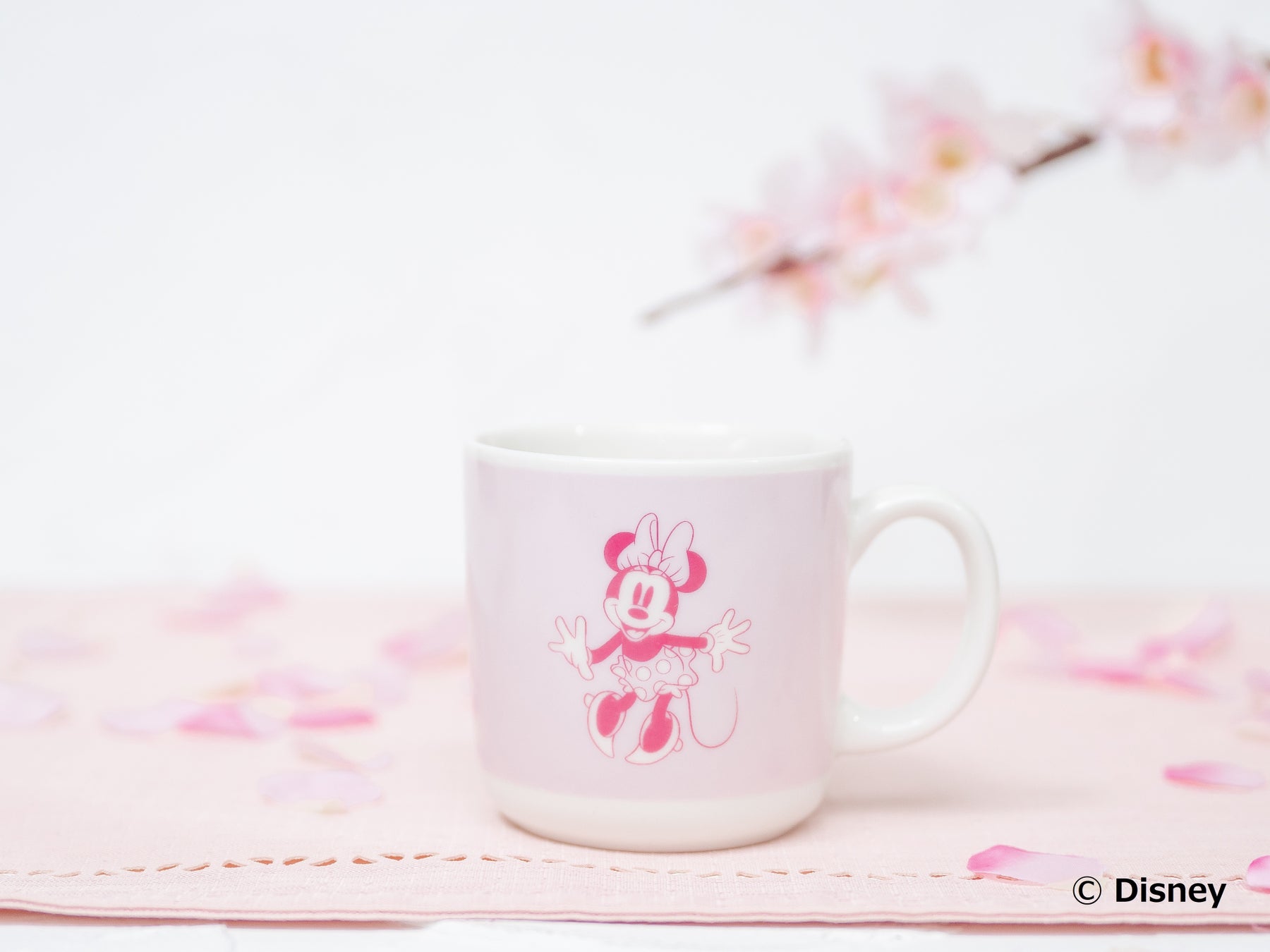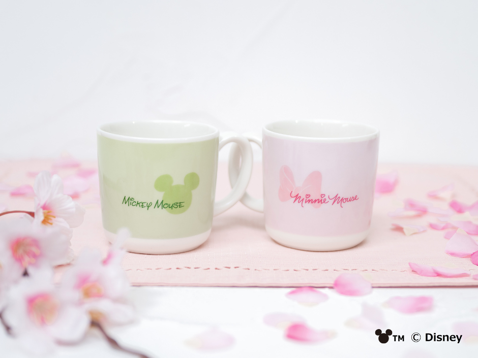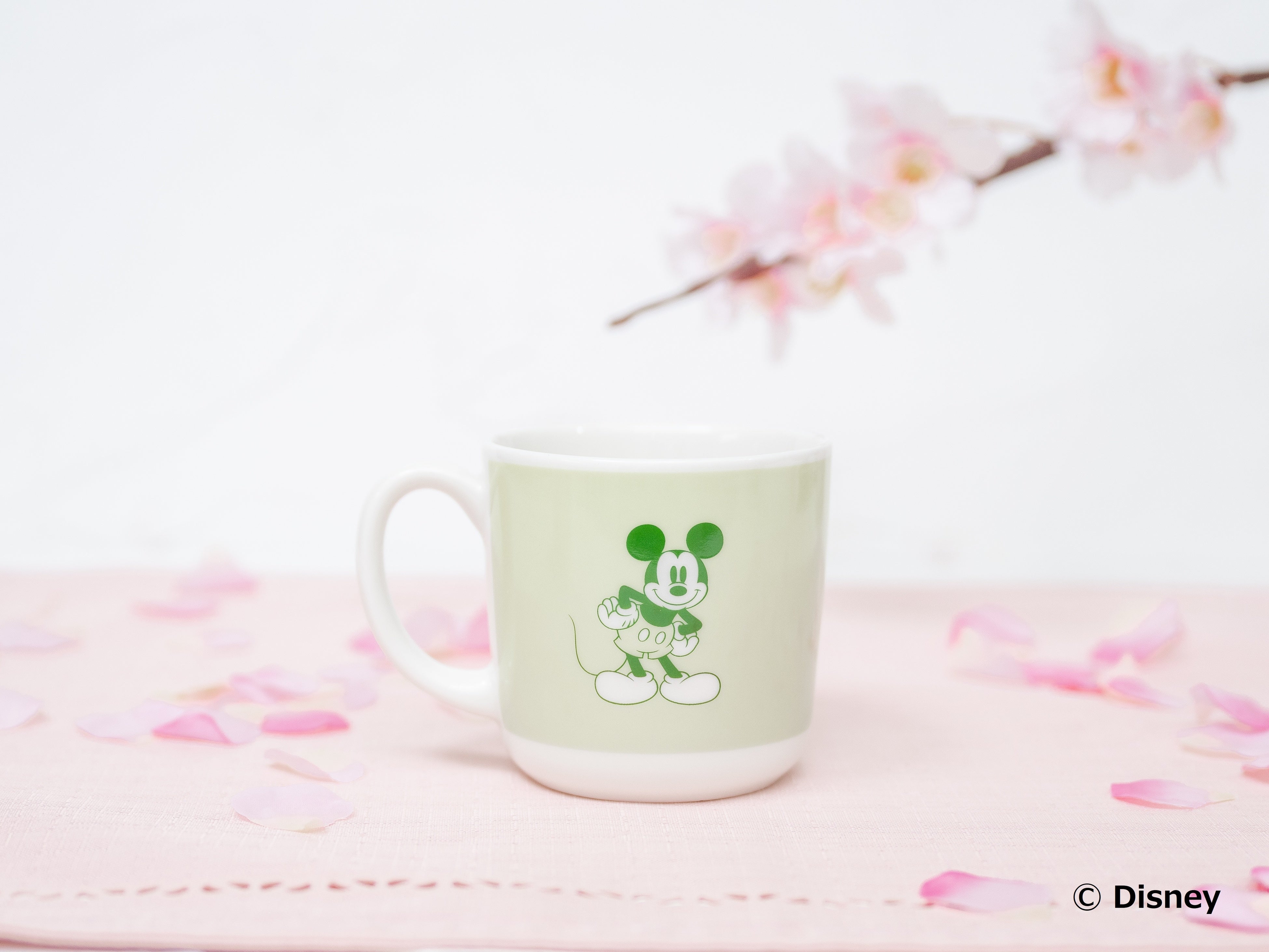 「春」「新生活」をイメージした、抹茶グリーンと桜ピンクカラーのマグカップとなっております。毎朝のコーヒータイムや、朝ごはんにちょうど良い、約180mlのサイズで、耐熱素材となっています。お部屋のインテリアにも合う馴染みの良いシンプルなデザインとなっており、裏側にはミッキーマウスのお顔のシルエットや、ミニーマウスのリボンにそれぞれのサインをデザインした細部までこだわったマグカップとなっています。