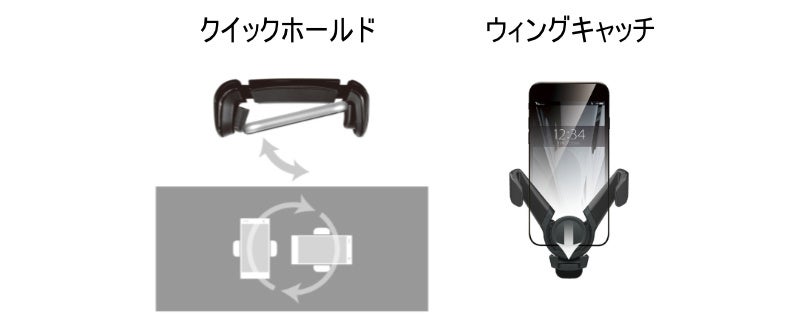 ホールド方法は、スマートフォンを押しあてるだけでホールドできる『クイックホールド』とスマートフォンを置くとウィングが閉じる『ウィングキャッチ』の2タイプで、どちらも片手で簡単に行える。『クイックホールド』はスマートフォンを横向きで使用することも可能