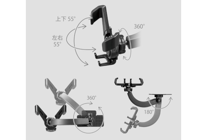 ホルダーを上下左右55度、ノブを緩めることでアームの角度を水平方向に180度、垂直方向に360度角度調整できる(画像はSA36)