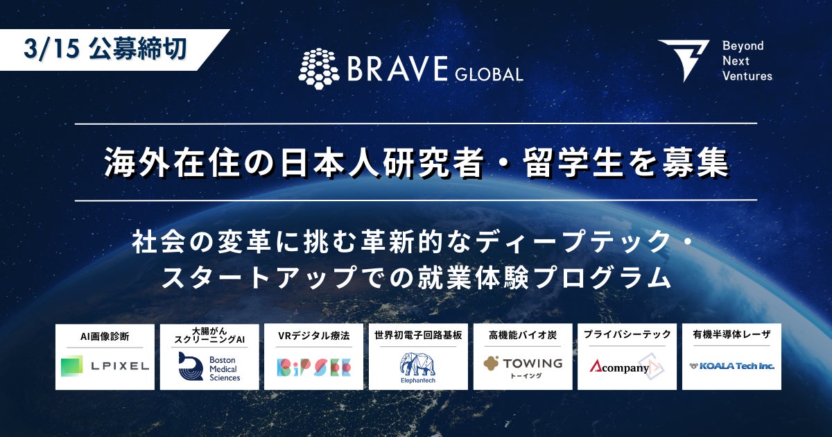 Beyond Next Ventures株式会社(本社:東京都中央区、代表取締役社長:伊藤毅)と株式会社tayo(本社:神奈川県横浜市、代表取締役:熊谷 洋平)は、ディープテック・スタートアップ創業支援プログラム「BRAVE GLOBAL」において開催される「就業体験プログラム」の公募を開始いたしました。本プログラムに参加を希望する海外在住の研究者・留学生の方は、公式ページよりエントリーをお願いいたします。