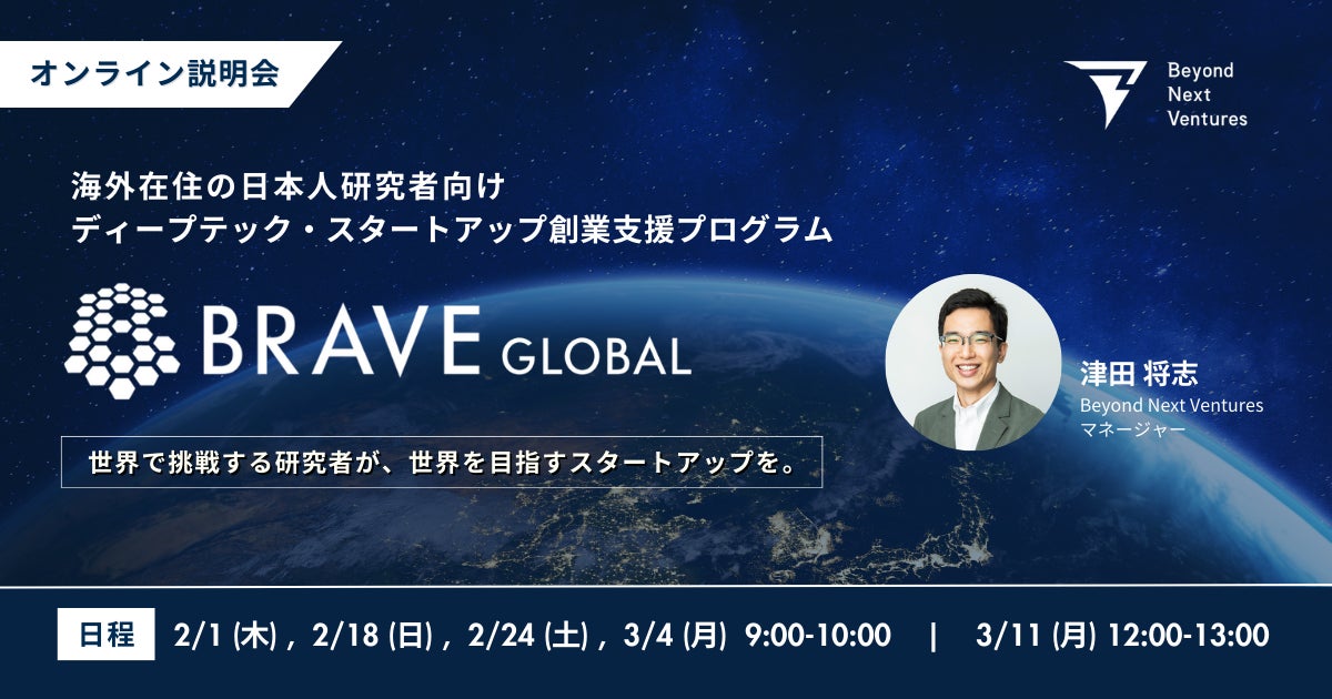 担当者より詳細をご説明しますので、ぜひご参加ください。なお、全ての日程でご都合が合わない方は、事務局(brave-global@beyondnextventures.com)までお問い合わせください。