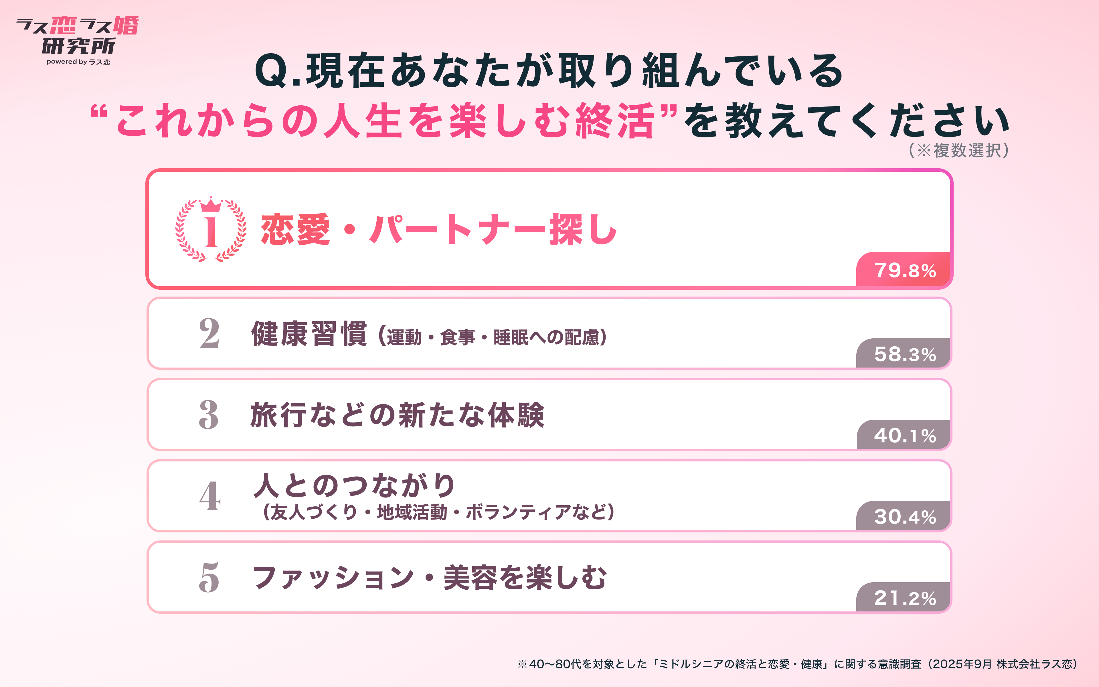 「これからの人生を楽しむ終活」の取り組みに関する質問では、1位「恋愛・パートナー探し(79.8%)」、2位「健康習慣(運動・食事・睡眠への配慮)(58.3%)」、3位「旅行などの新たな体験(40.1%)」が上位に。