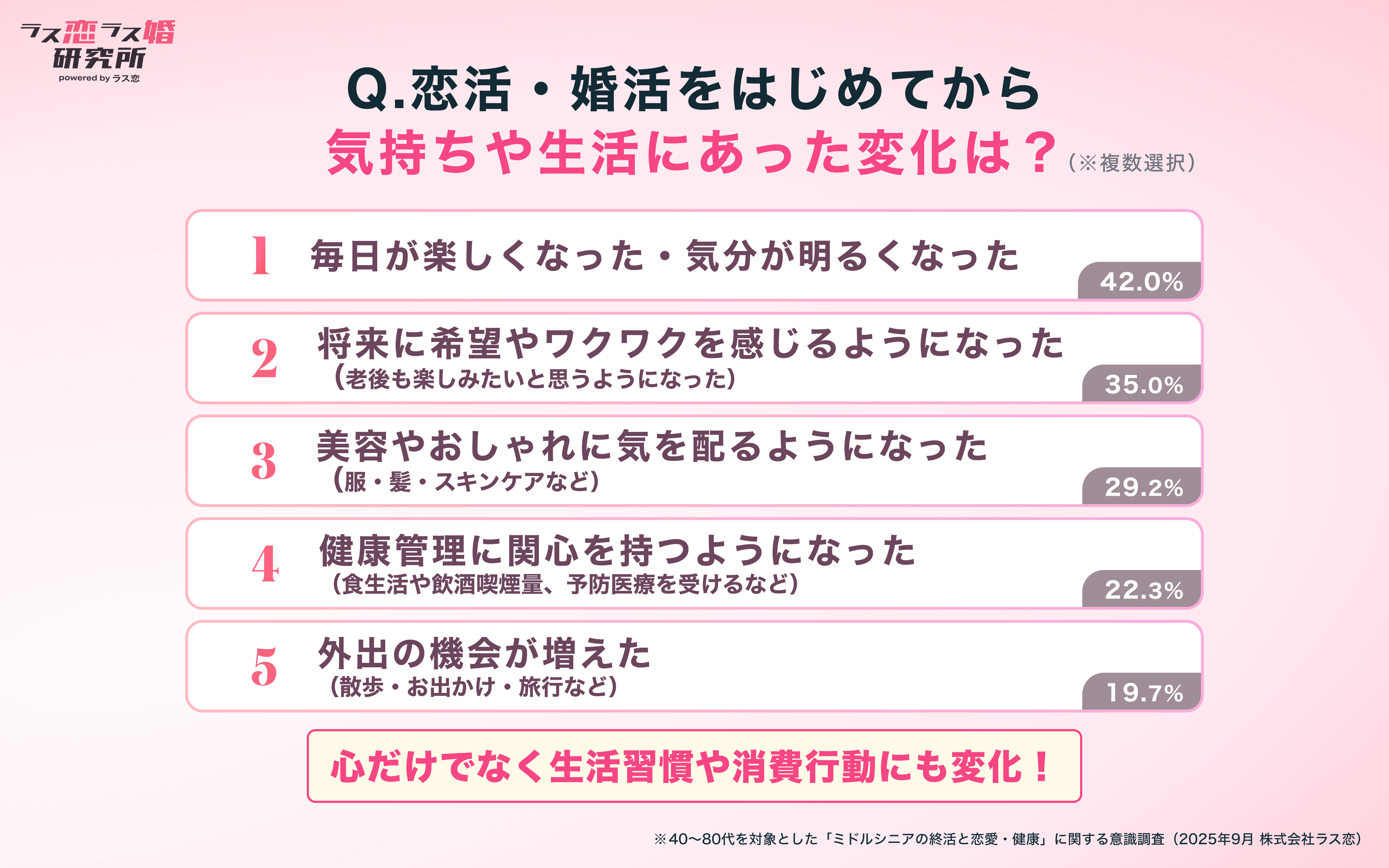 株式会社ラス恋(アイザックグループ/本社 : 東京都渋谷区/代表取締役CEO : 山口 昂星)が運営する、対象年齢が40歳以上の恋活・婚活マッチングアプリ「ラス恋」は、40〜80代の「ラス恋」ユーザー1,926名を対象に「恋愛と健康寿命」に関する意識調査を実施しました。
