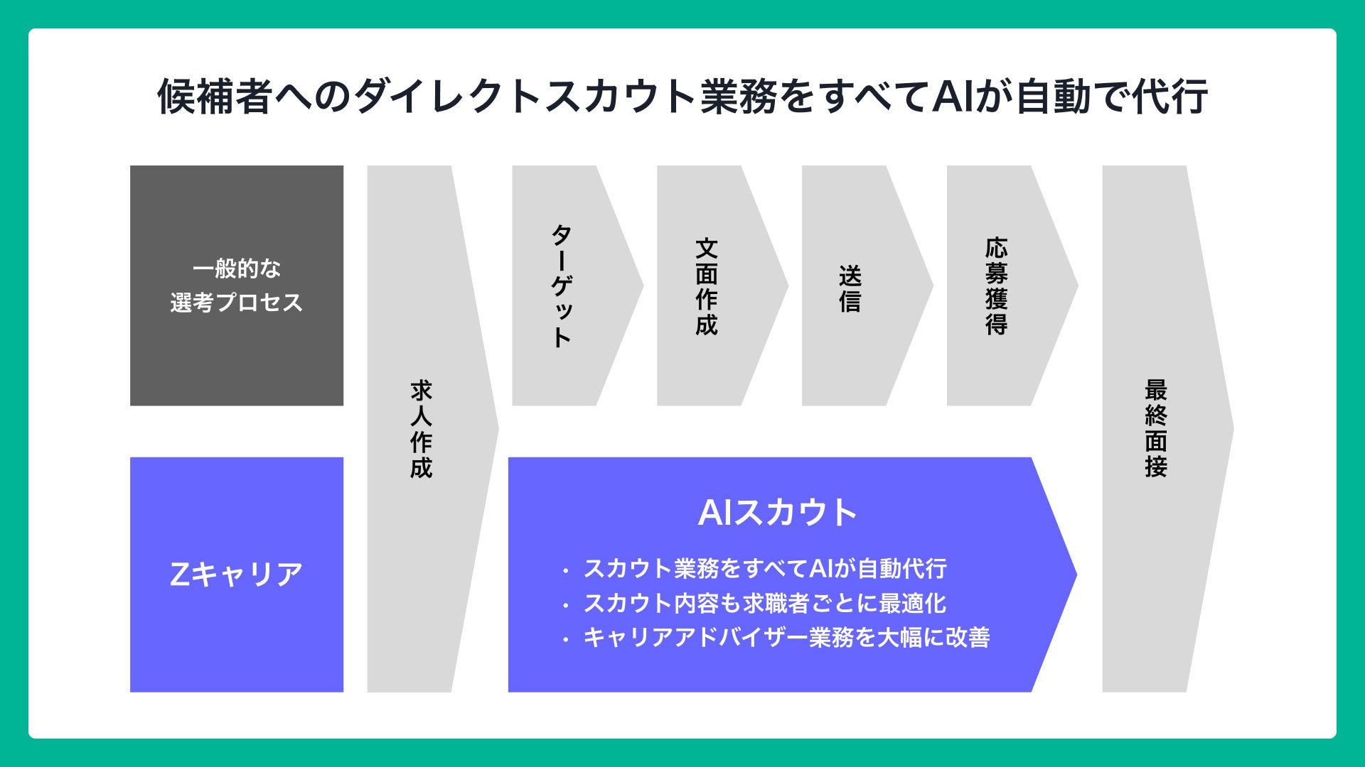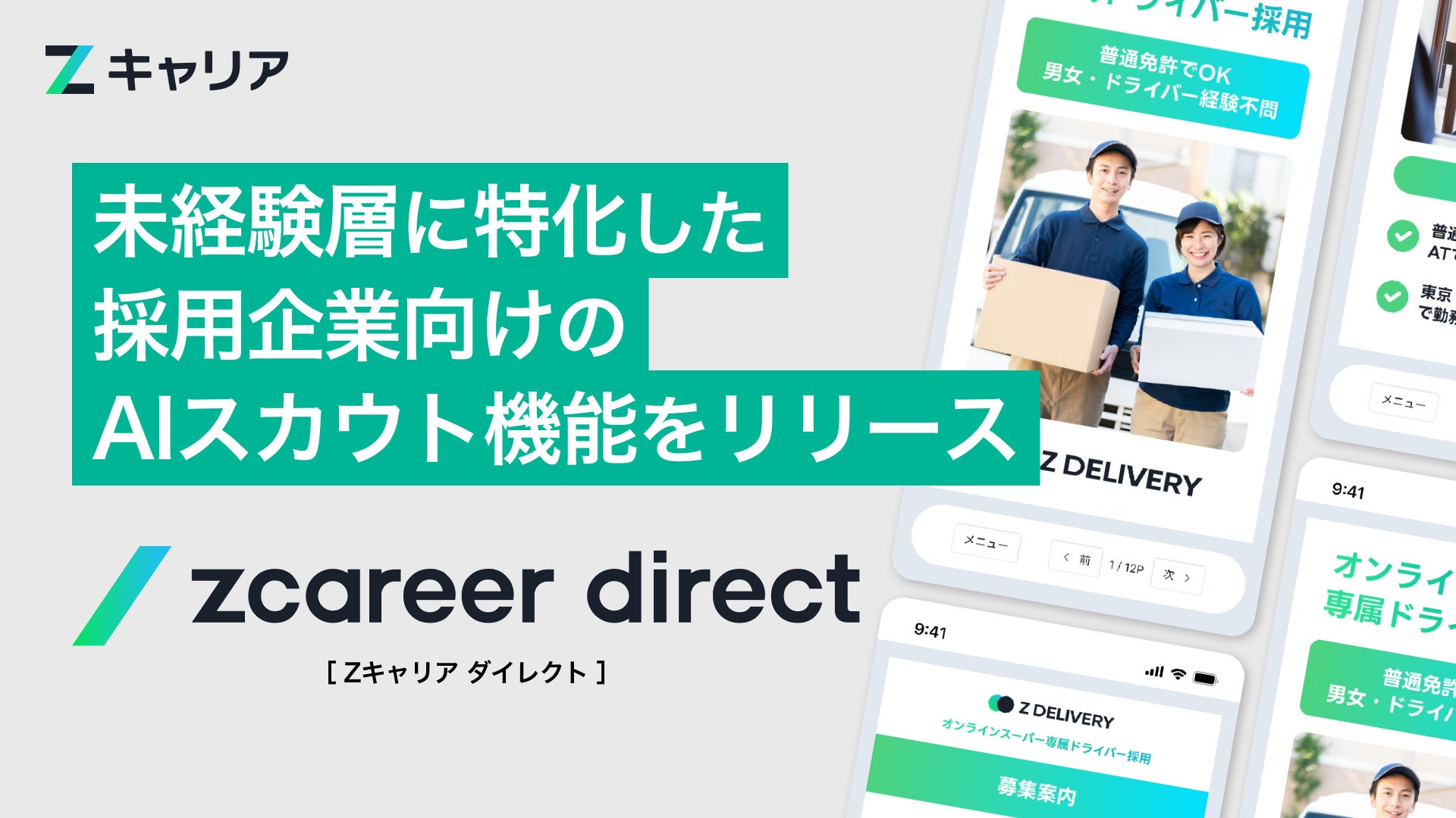 この度、新たに採用企業向けのダイレクトスカウトサービス『Zキャリア ダイレクト』を正式に提供開始いたします。『Zキャリア ダイレクト』は、20〜30代の未経験層の求職者をメインターゲットとした採用チャネルの提供であり、採用企業のみなさまにとってより効率的な求職者アプローチを実現する、日本初のダイレクトスカウトサービスです。強みは、採用企業が求めるスキルや経験などの条件にとどまらず、未経験ながらも将来性や成長ポテンシャルを秘めた若手の求職者層に向けて、独自のAIスカウト機能を活用することで効率的にアプローチし、採用活動そのものを効率的に推進できる点です。ダイレクトスカウト業務におけるターゲット設定をAIが自動で代行し、スカウト内容の文面作成も候補者それぞれにあわせてAIが自動で最適化するなど、ターゲット設定から応募獲得までの一連のダイレクトスカウト業務をAIが代行することで、採用担当者にとってのスカウト業務の負担を軽減すると同時に、従来の採用活動ではアプローチの機会がなかった新たな求職者層にリーチすることが可能となります。