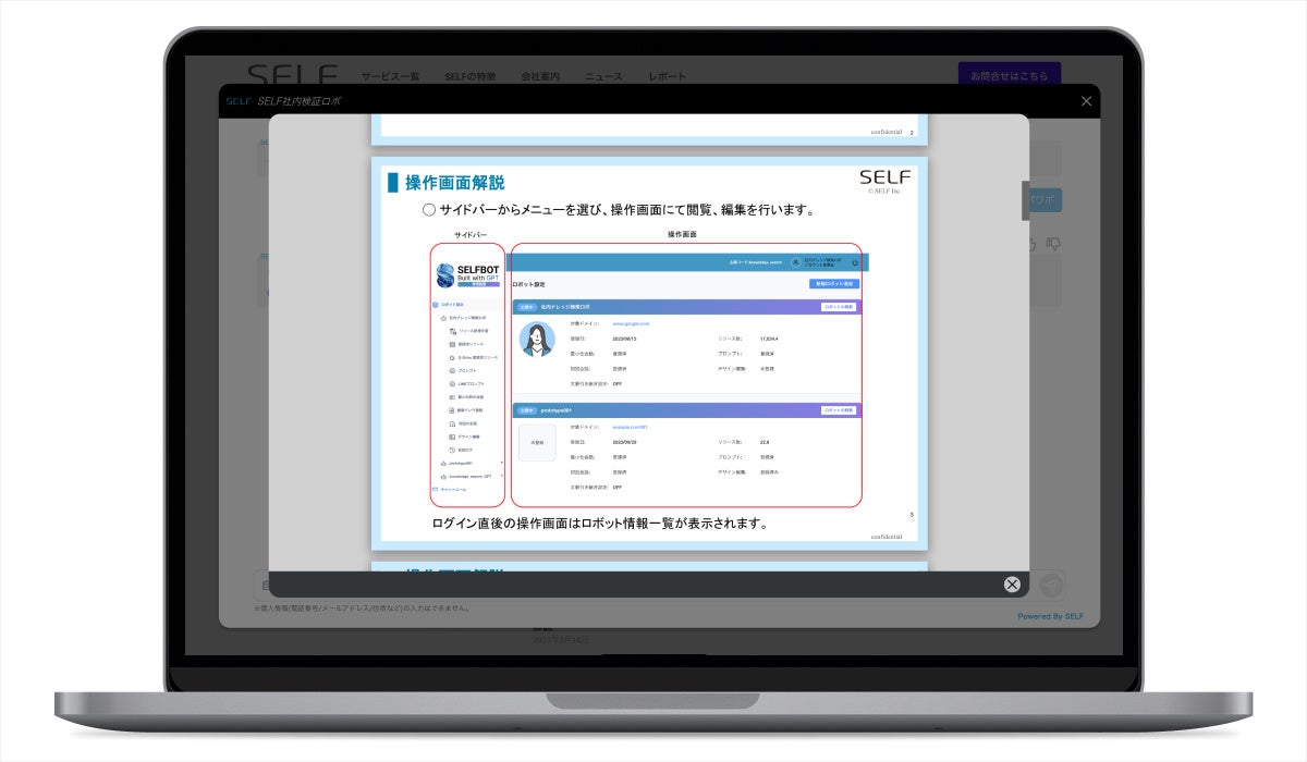 SELF株式会社(本社:東京都新宿区、代表取締役:生見 臣司、以下:SELF)は、自社開発のコミュニケーションAIとOpenAI社が展開するChatGPTとの相互連携システム「SELFBOT」を開発・運用しています。このたび、ドキュメントプレビューの新機能を追加いたしました。https://self.systems/selfbot/