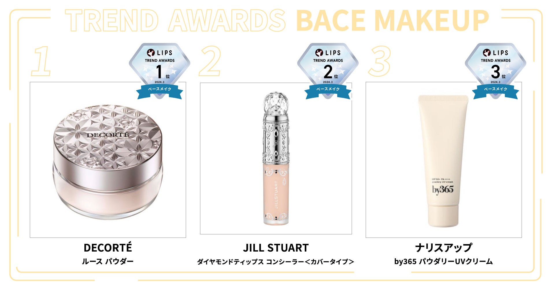 今月は春夏の新作ベースメイクアイテムの情報解禁や発売が相次ぎ、ベースメイク部門に注目! そんな中でも先月から順位を譲らず堂々1位を獲得したコスメデコルテの新フェイスパウダーの人気の高さは脱帽もの。