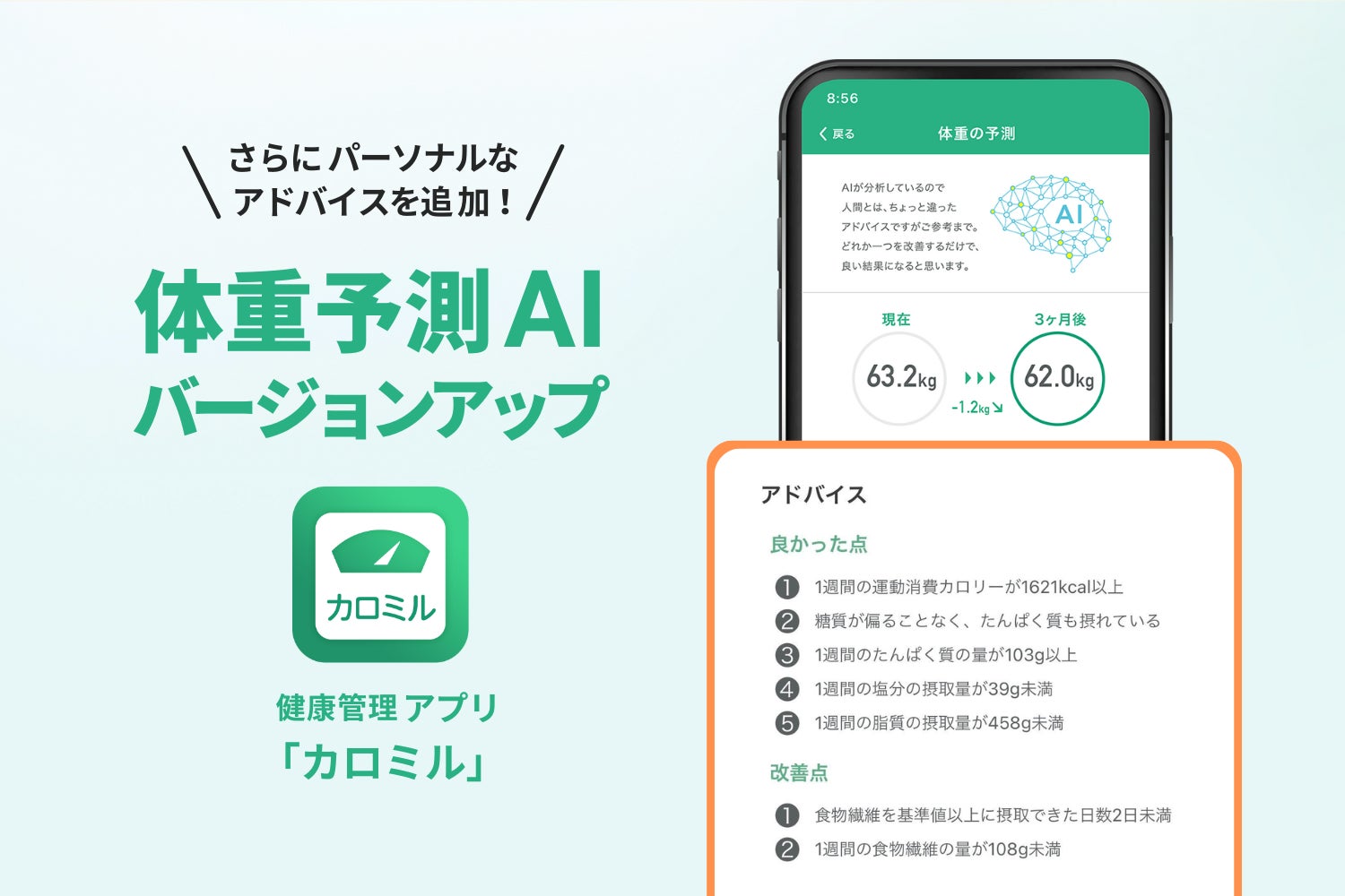 「カロミル」の体重予測AIがバージョンアップ!食事、運動、体重を加味するパーソナライズされた予測が可能に
