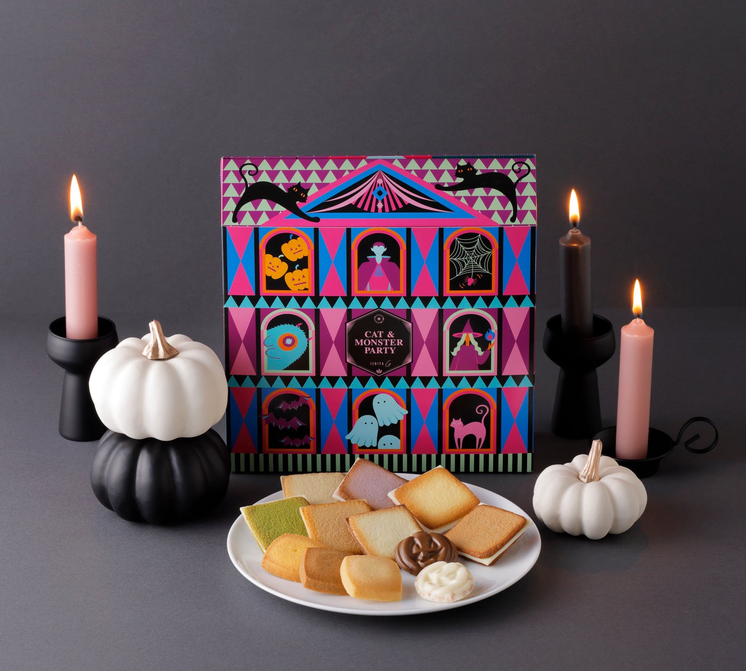 お城の窓からモンスターたちがお出迎え!箱を開いて扉を開けると、中には定番商品の「サク ラング・ド・シャ」をはじめ、ハロウィンらしい装いのクッキーやチョコレートが隠れています。扉の内側に描かれたハロウィンにまつわる英語を一つずつ覚えながらお菓子を楽しめる、遊び心いっぱいのひと箱です。