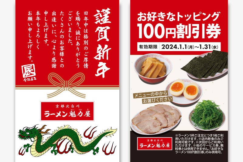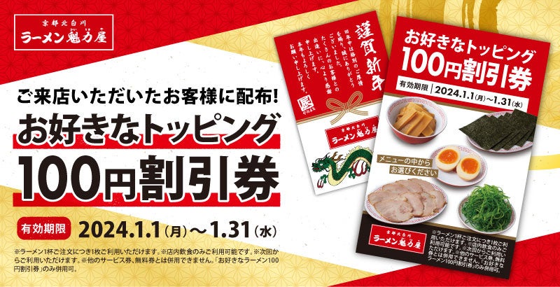 ぜひこの機会に、魁力屋で熱々のラーメンを食べて「お好きなトッピング100円割引券」をゲットし素敵なお正月をお過ごしください。