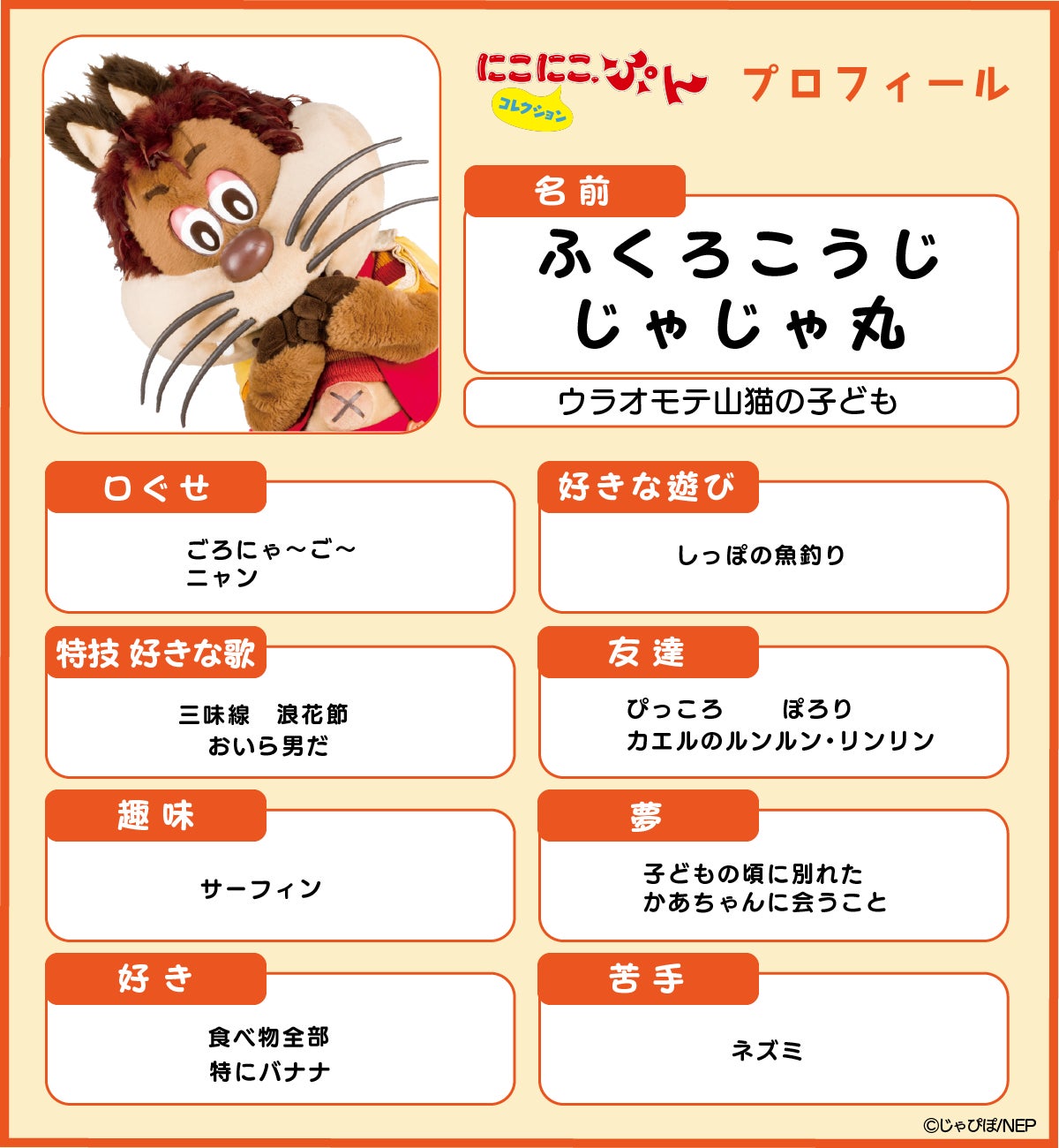 「にこにこ、ぷん」は、『おかあさんといっしょ』の中で1982(昭和57)年4月5日から1992(平成4)年10月3日まで放送された人形劇。「にこにこ島」を舞台に、じゃじゃ丸、ぴっころ、ぽろりの3人が、ともに笑い、ときにはけんかをして泣き、またあるときは冒険をしたりする、勇気と友情あふれる物語。